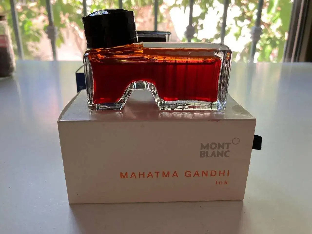Tintero Montblanc Mahatma Gandhi (Tinta color azafrán). Está, a ojo, a más de 4/5 de su capacidad