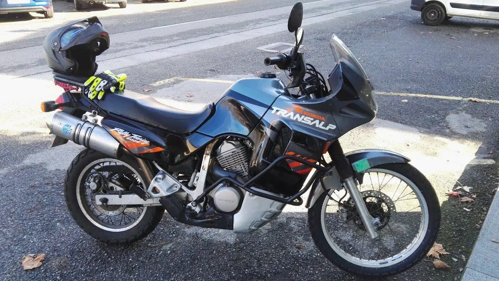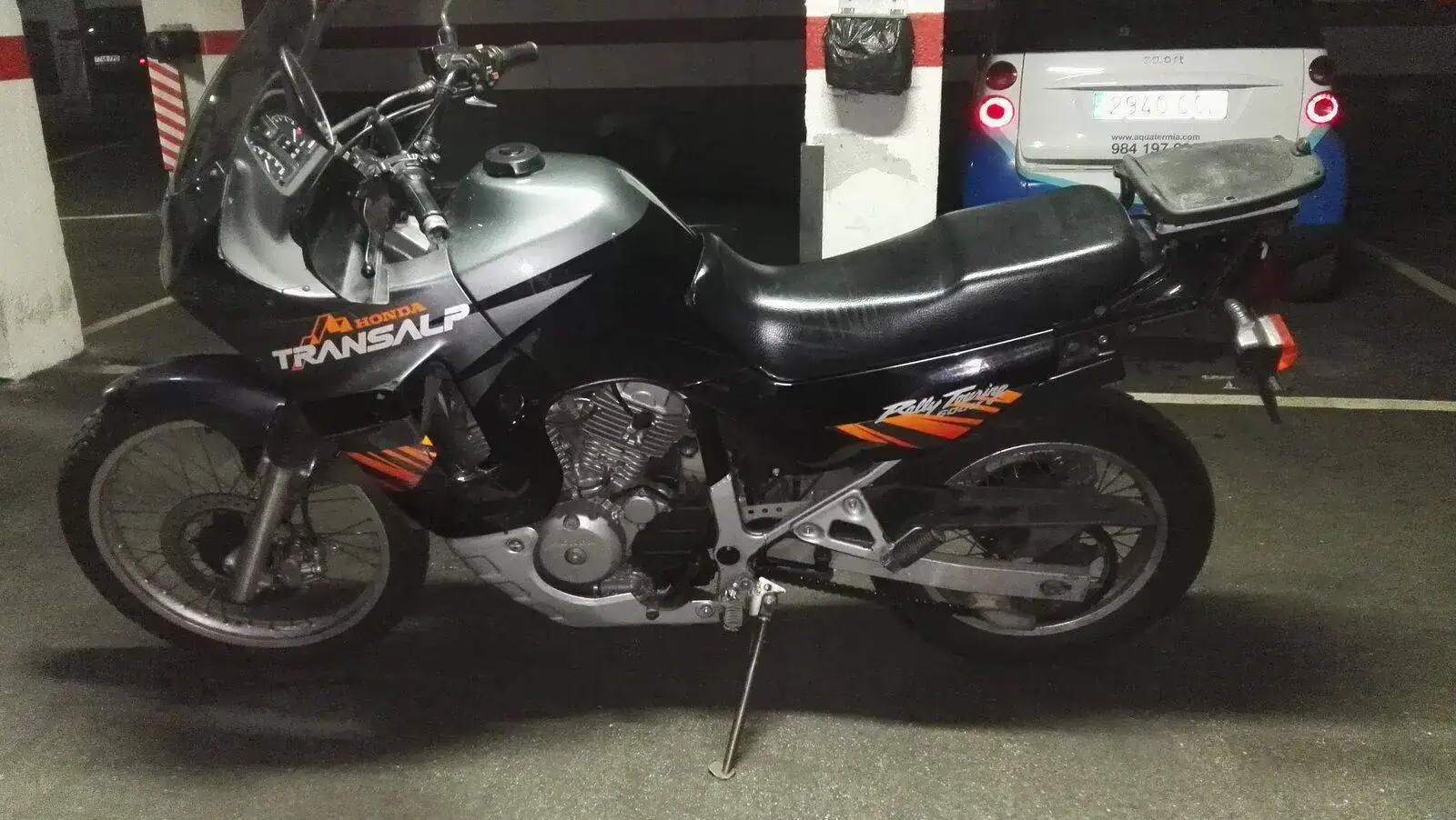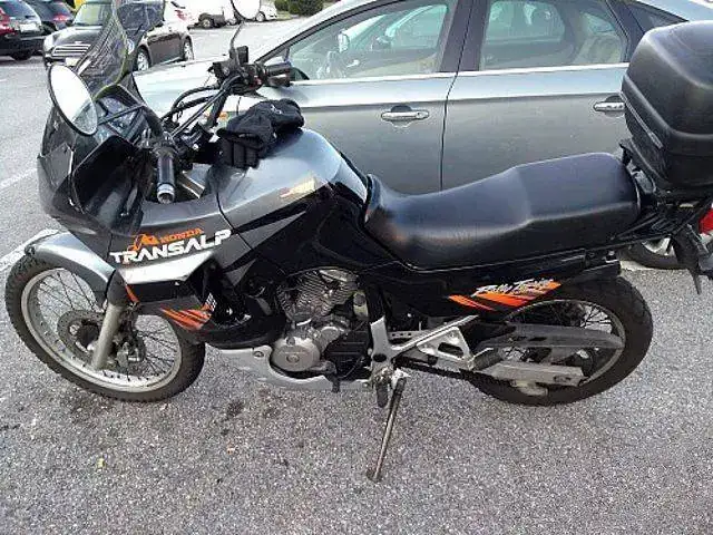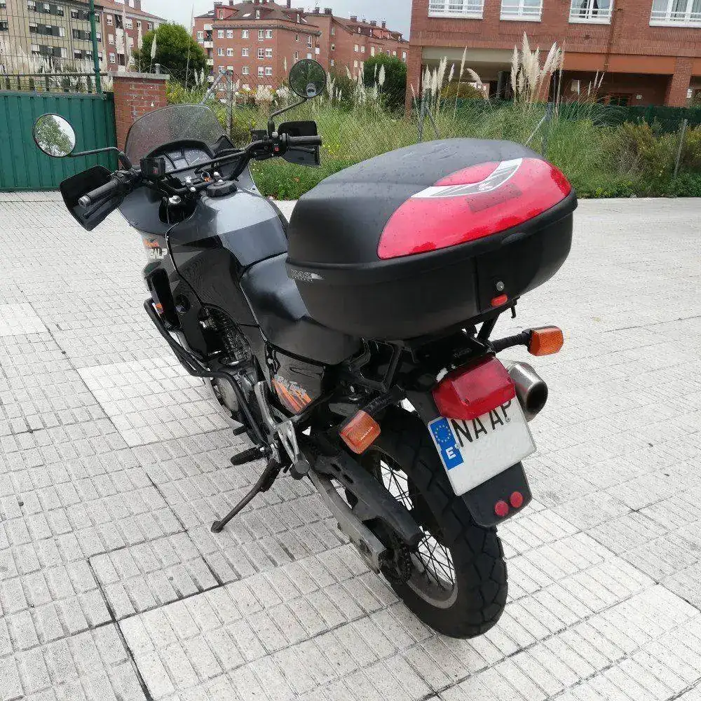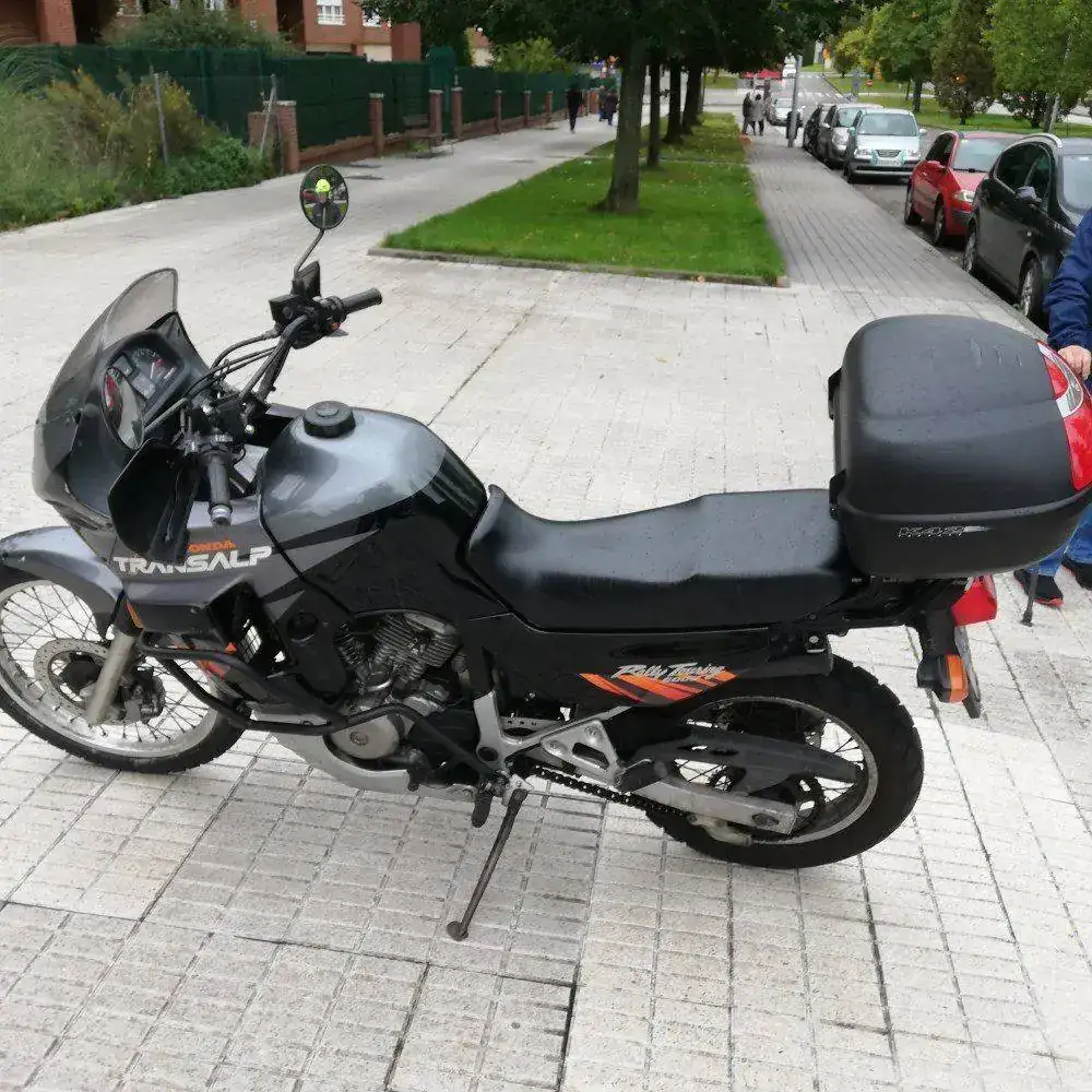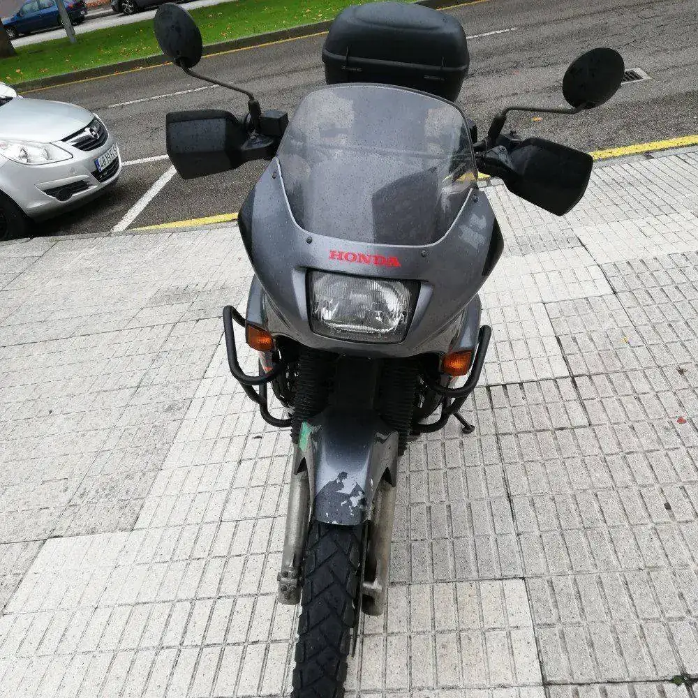 Es una HONDA TRANSALP XL600V de 1996. Una moto de los últimas hornadas de las fabricadas en Japón, no en Italia. Dura como ella sola. Los plásticos son originales e incluso tiene sus dos pantallas, una baja y otra alta. Hasta tiene en su cajoncito sus herramientas originales.