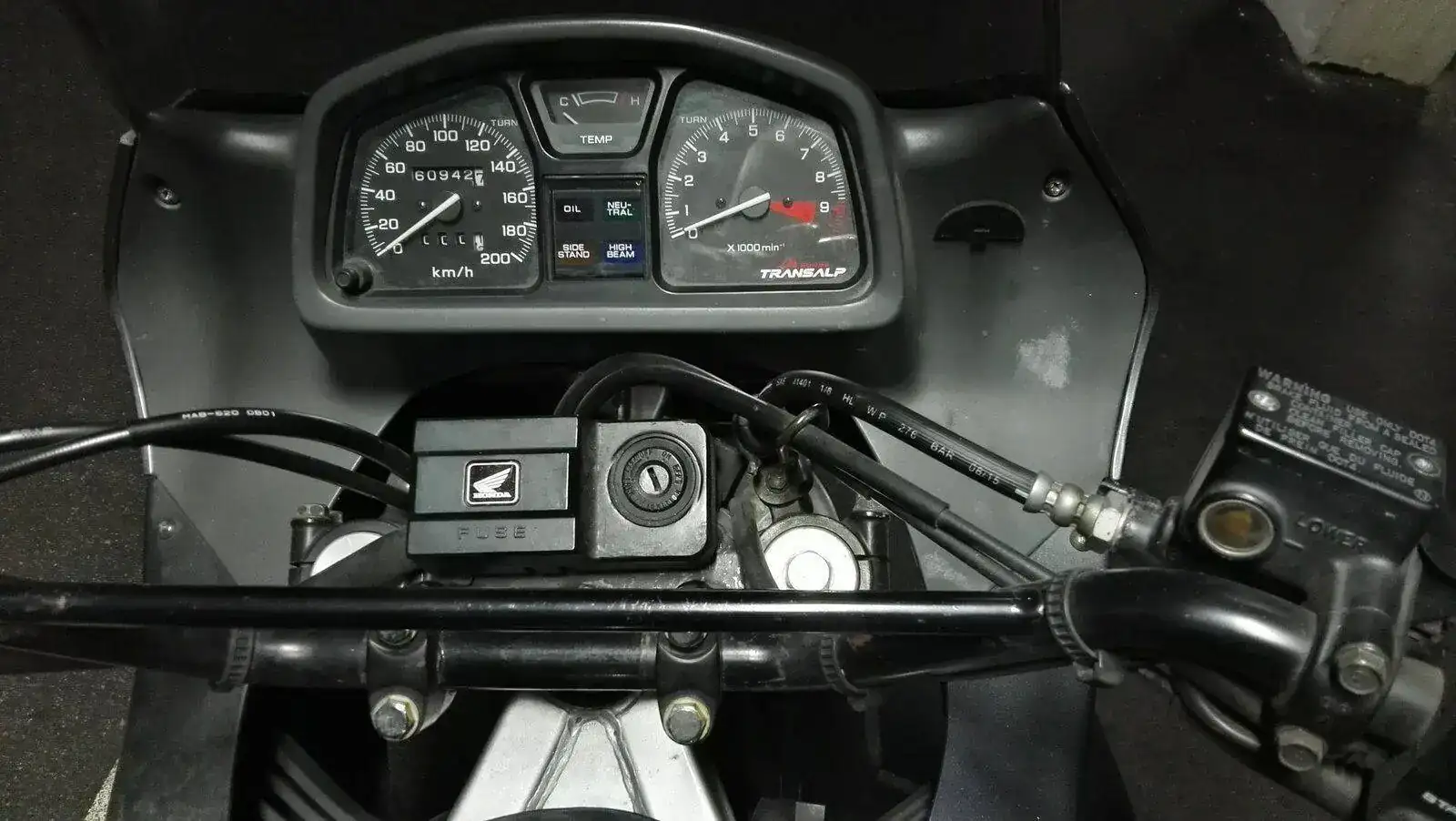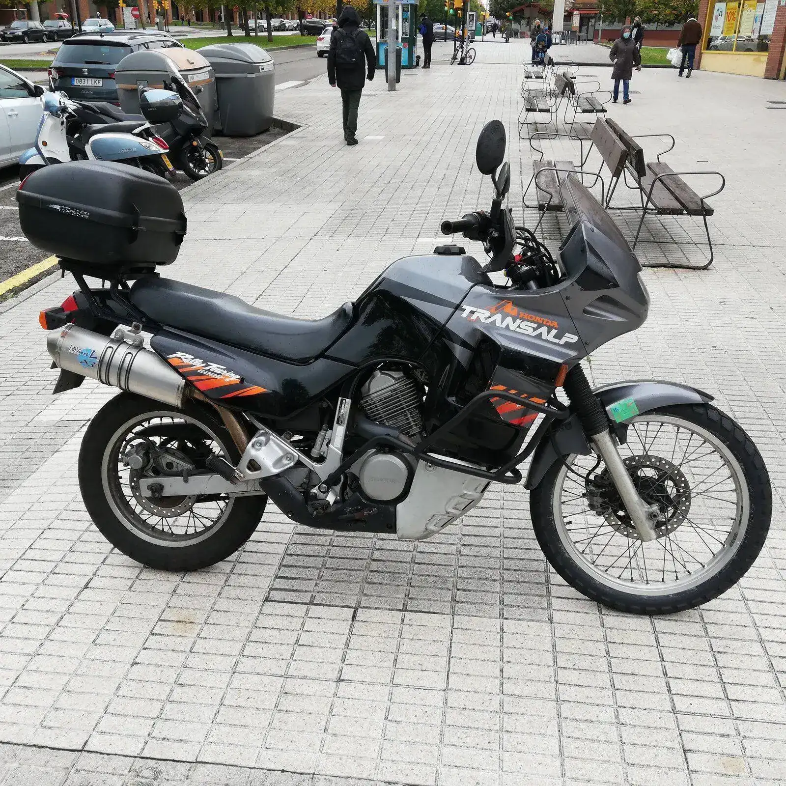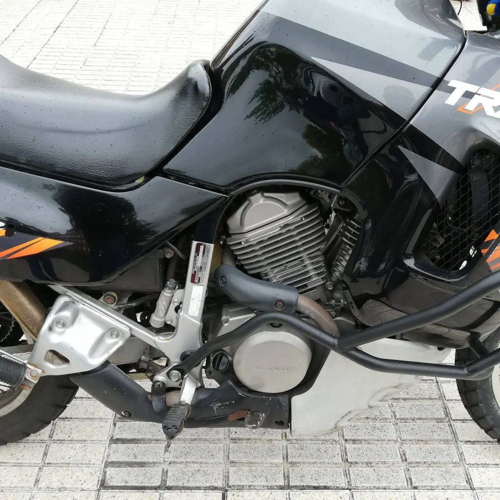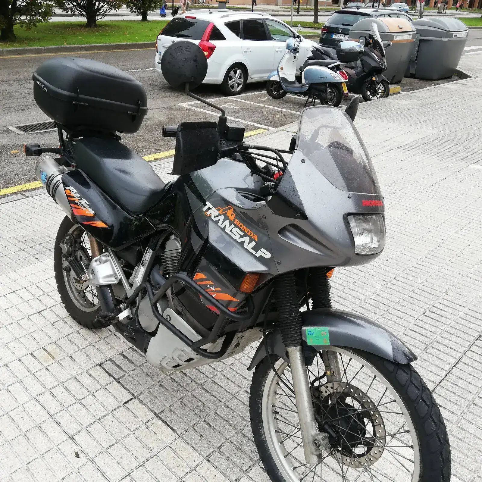 Es una HONDA TRANSALP XL600V de 1996. Una moto de los últimas hornadas de las fabricadas en Japón, no en Italia. Dura como ella sola. Los plásticos son originales e incluso tiene sus dos pantallas, una baja y otra alta. Hasta tiene en su cajoncito sus herramientas originales.