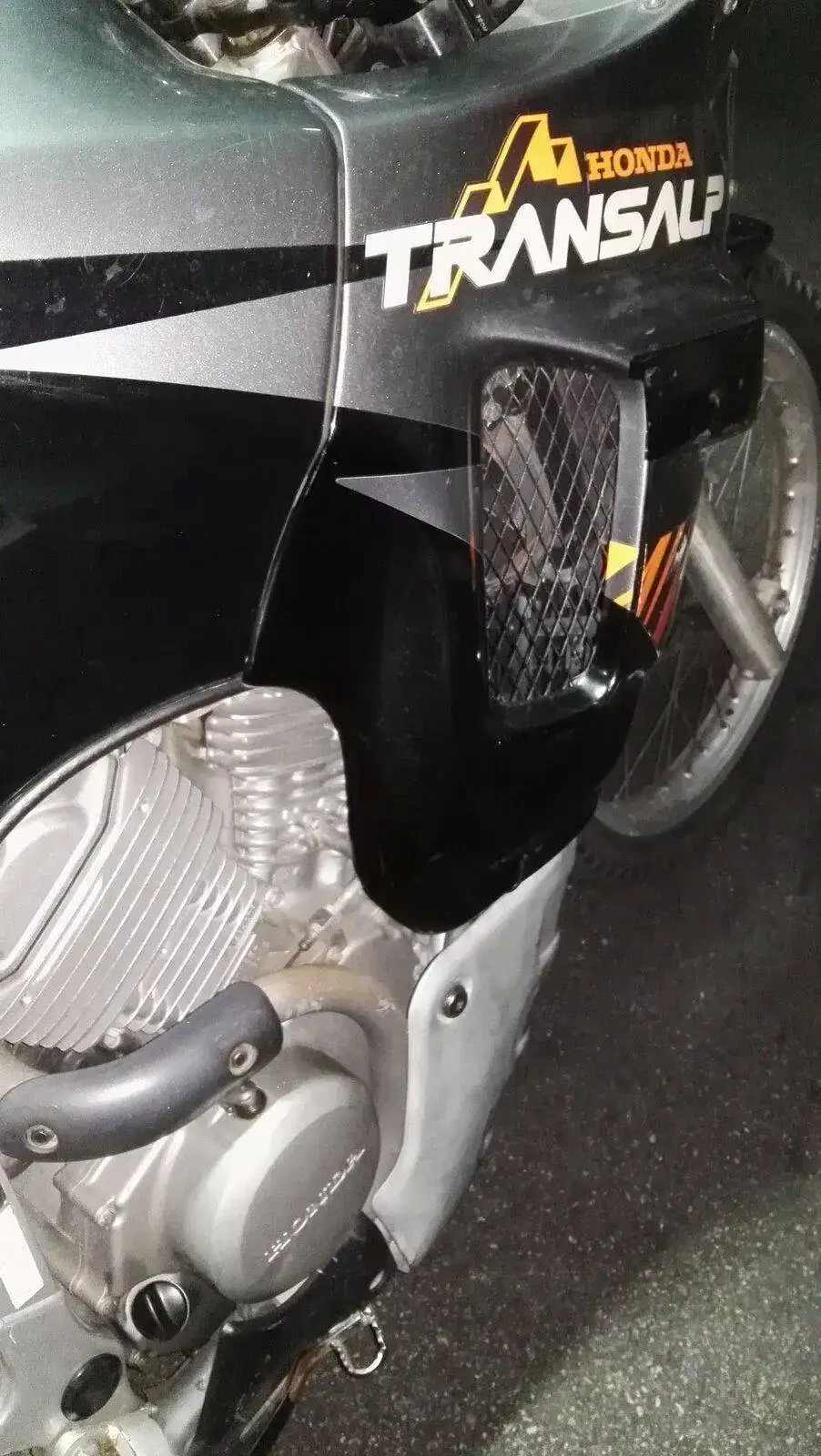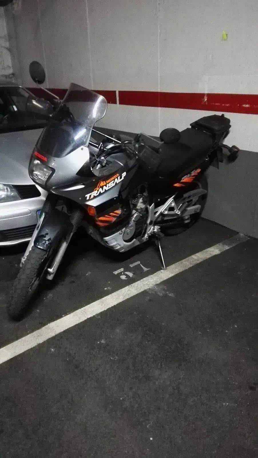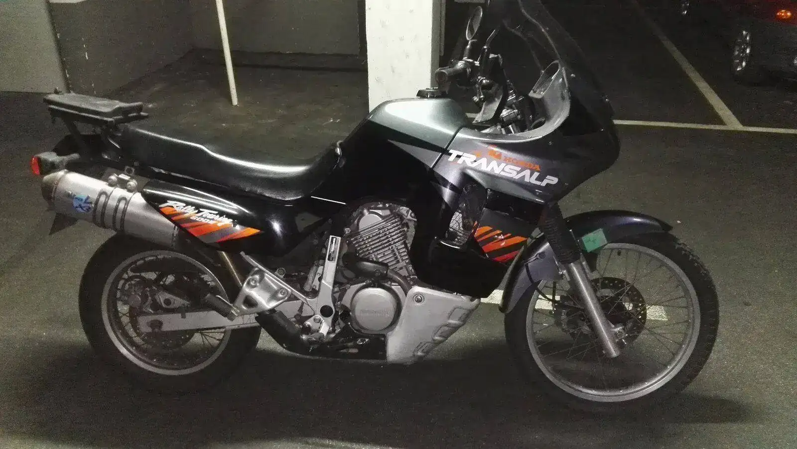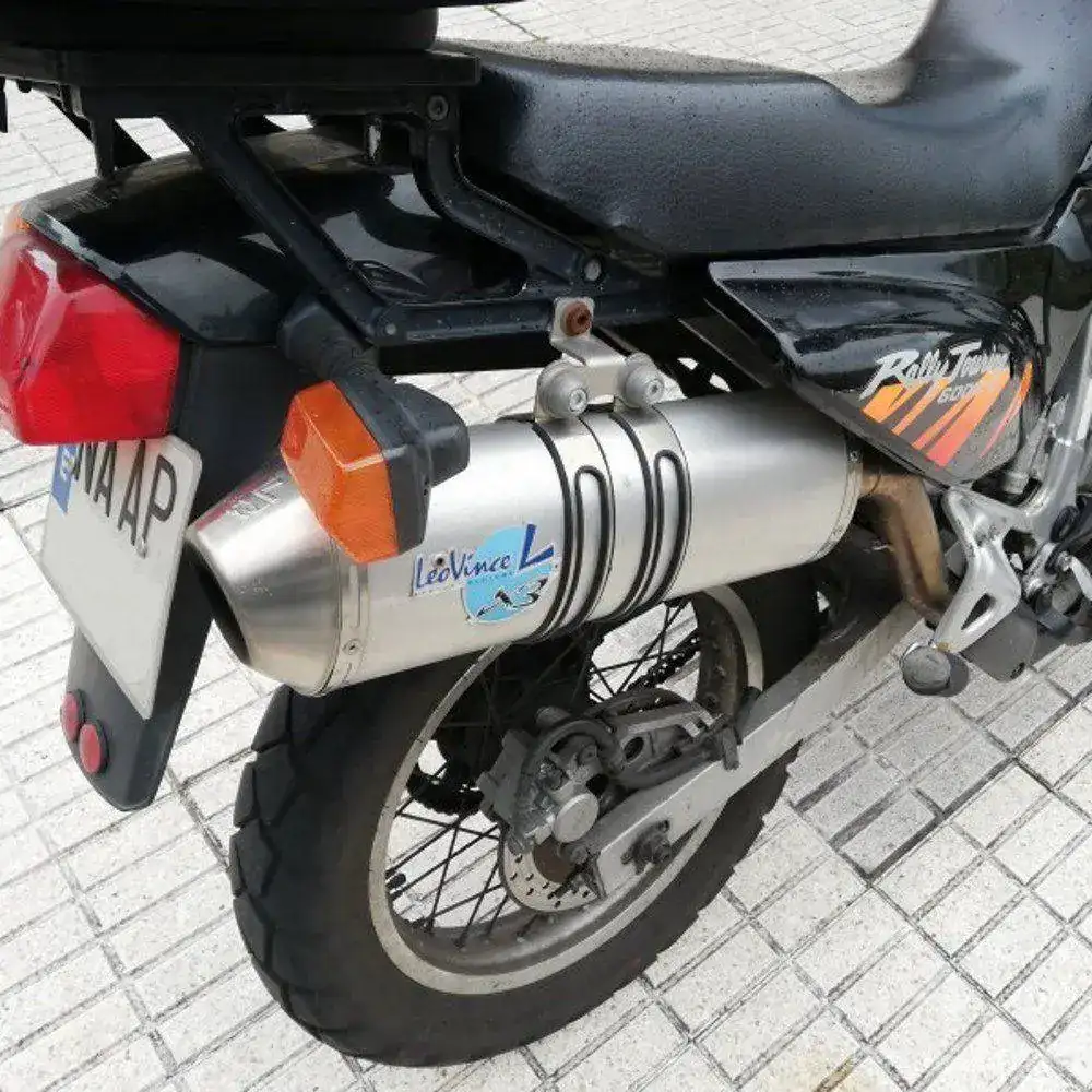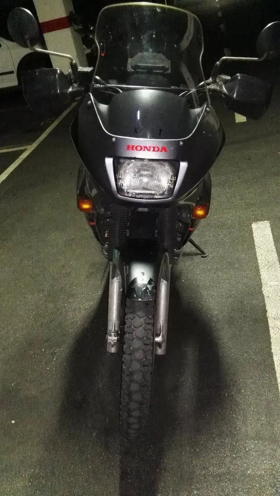 Es una HONDA TRANSALP XL600V de 1996. Una moto de los últimas hornadas de las fabricadas en Japón, no en Italia. Dura como ella sola. Los plásticos son originales e incluso tiene sus dos pantallas, una baja y otra alta. Hasta tiene en su cajoncito sus herramientas originales.
