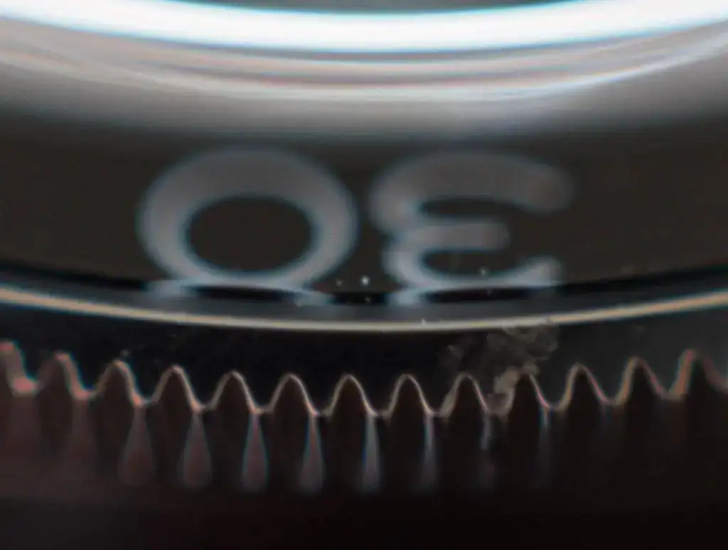 El reloj ha sido objeto de un uso ocasional y está en buen estado, con pequeñas marcas por dicho uso ocasional y por el cambio de correas. Si que tiene una marca en el bisel, a la altura del "30", pero que a simple vista casi ni se ve, aunque incluyo una foto ampliada de dicha zona.