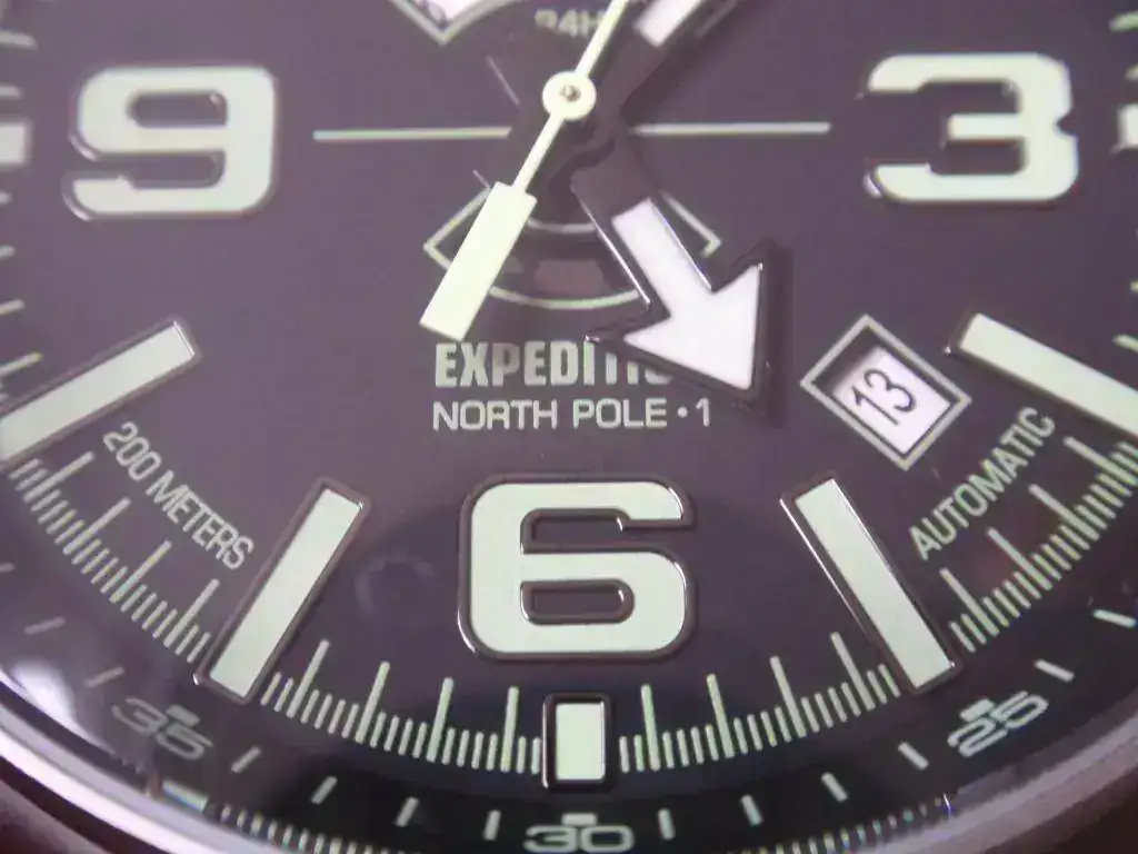 DIAL: esfera verde con horas, minutos, segundero central y fecha situada entre las 4 y las 5. Indicador de 24 horas. Indicador dia/noche. Manecillas en color negro, indices en color verde con iluminacion por Super Luminova.