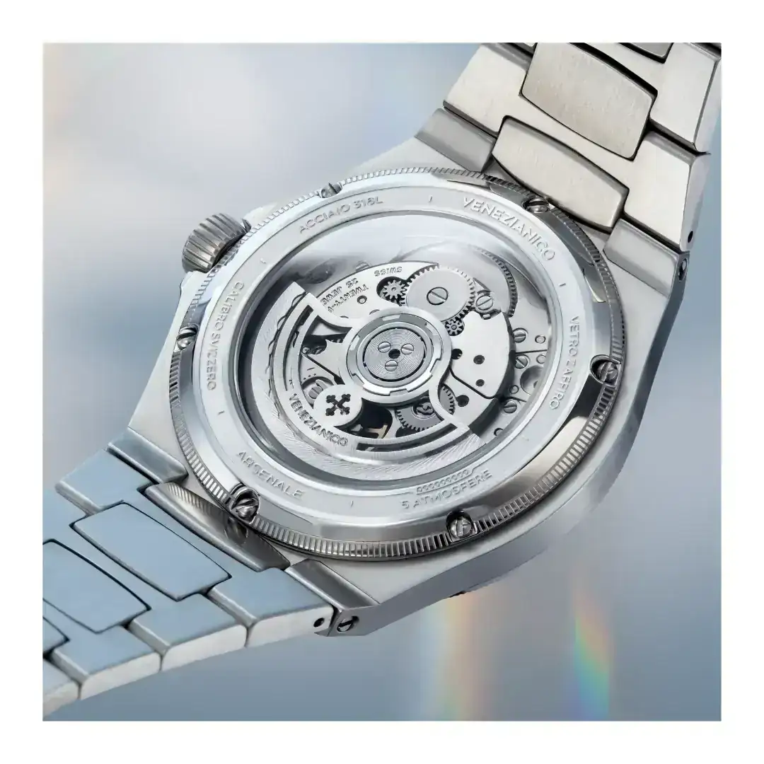 Arsenale Platino combines clean lines with the uniqueness of an incorruptible metal. The dial is finished using a special process developed by our team, combining controlled tumbling and a platinum galvanic treatment. The result is a vibrant, deeply luminous texture, unique to each piece. The 40...