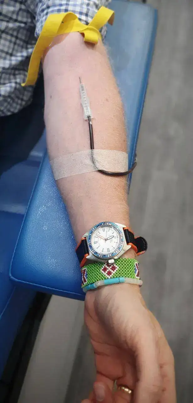 Esta mañana mi Baikal solidario y yo, fuimos a donar sangre. Le pedí a la enfermera que me hiciera la foto, y la verdad que le hizo a ella mucha gracia el asunto...