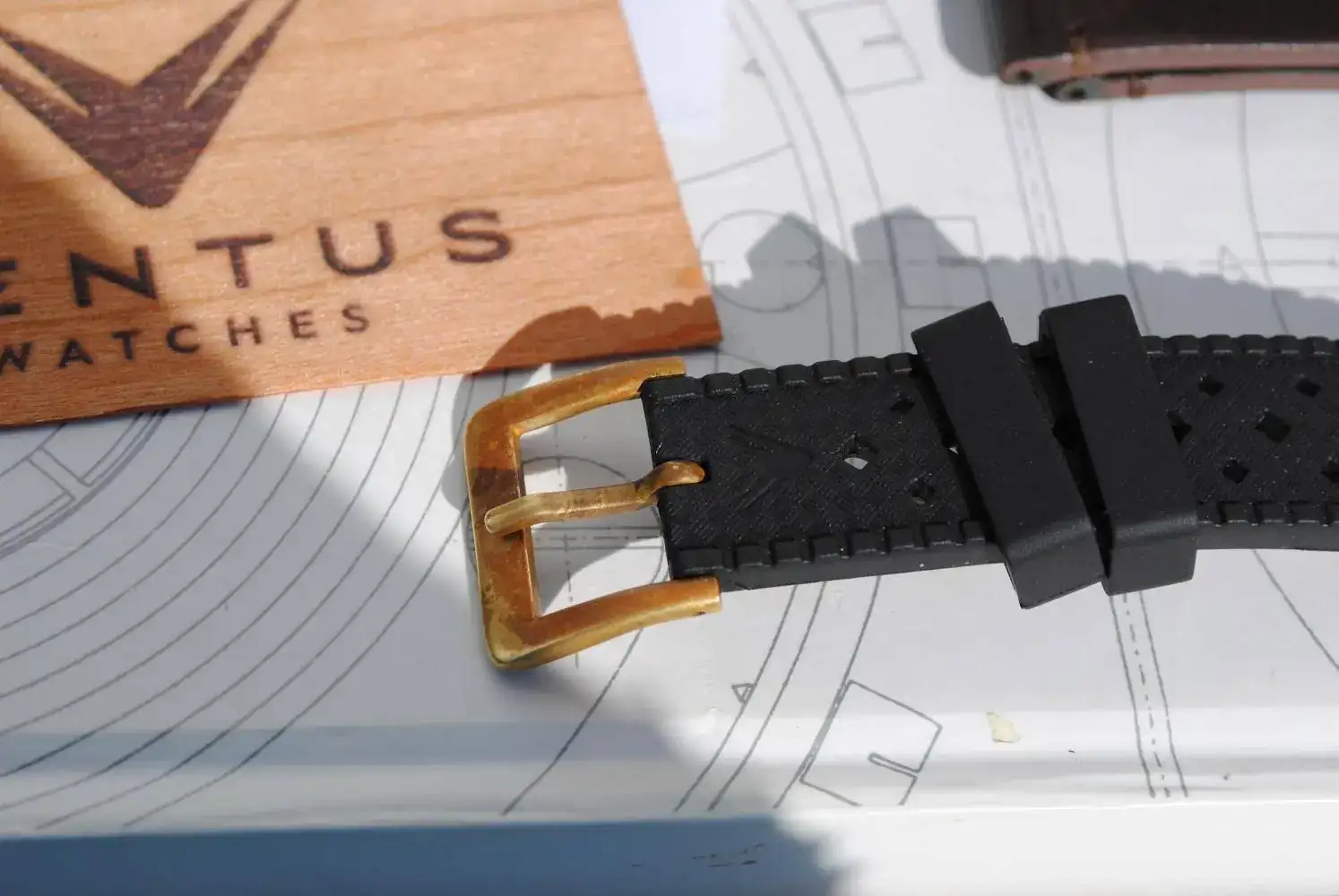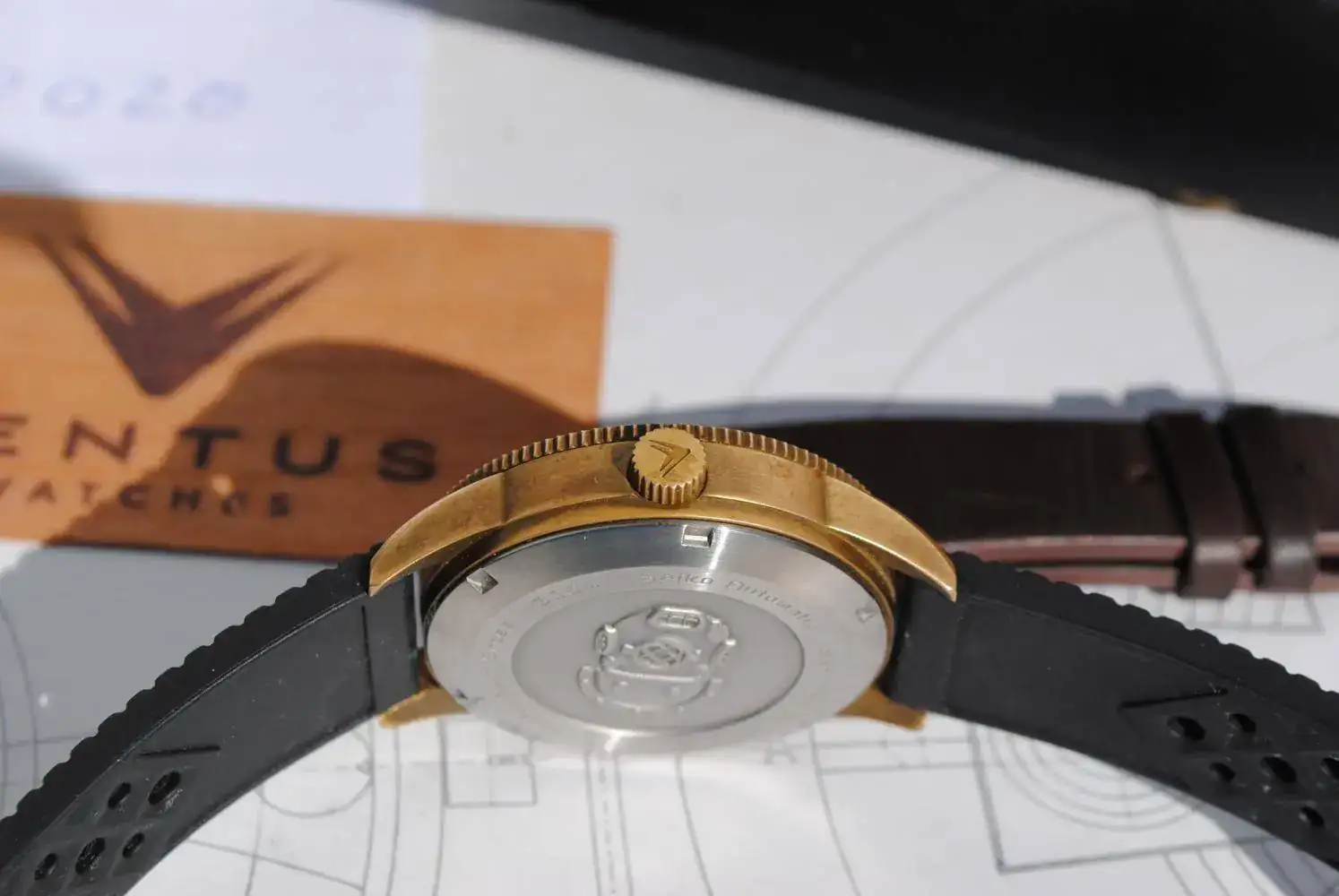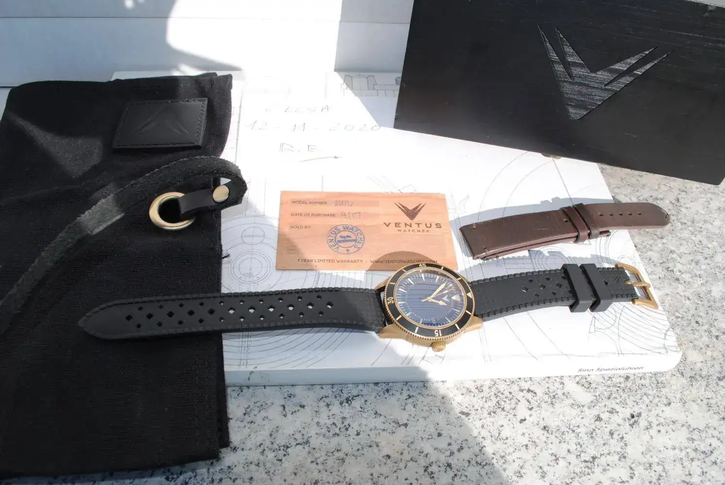 Lo envío con su estuche de madera, su tarjeta de garantía ya espirada y sus correas originales : La tropic negra y la minimalist de piel marrón oscuro. Ambas firmadas y con un sólo bucle de latón que es cómo vienen estos Ventus.