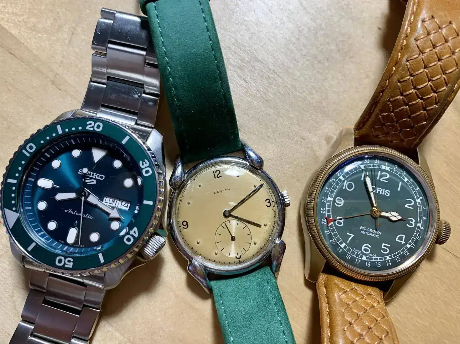 Tres relojes muy diferentes. Un seiko, un zenith de los 40 y un Pointer Date