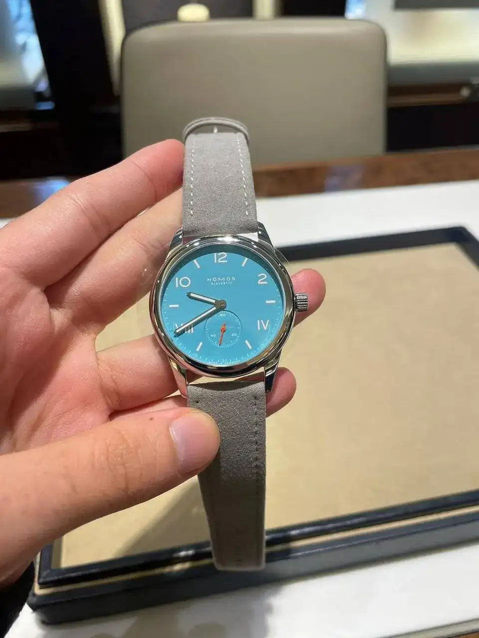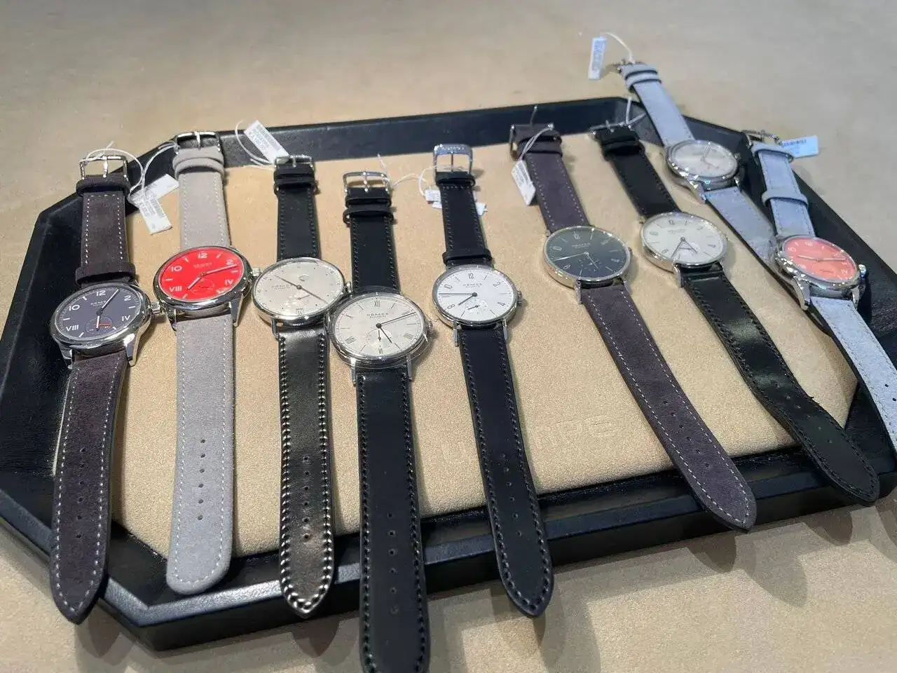 Con este reloj como opción, aunque en el fondo no estaba muy seguro, me fui a ver los otros vendedores de Nomos. Todos estaban a 5 minutos andando de mi hotel. Por resumir las siguientes 3 o 4 paradas, solo tenían dos modelos en stock, los últimos que habían salido: "nonstop red" (ref. 716) y "endless blue" (ref. 717). Aunque son muy bonitos, buscaba algo menos llamativo y que pudiese usar en más ocasiones.