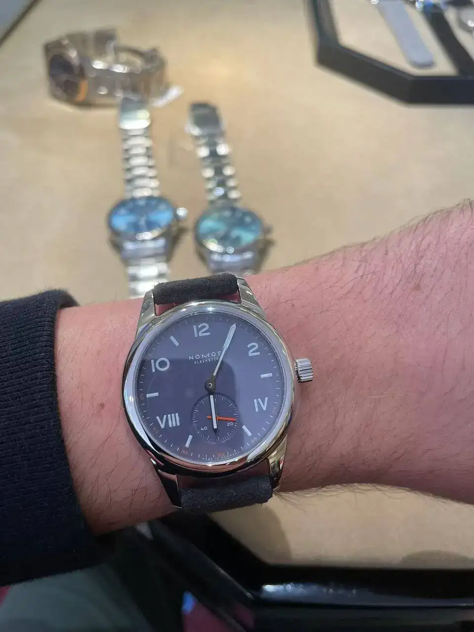 La primera parada fue Wempe, pude ver los principales modelos y aunque todos me gustaron, el que más encajaba conmigo era el Club Campus. No tenían muchos colores, pero el "blue purple" (ref. 713) me gusto bastante. El problema de los Club Campus para mi es el segundero naranja, pero en este caso no me molestaba.