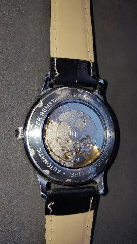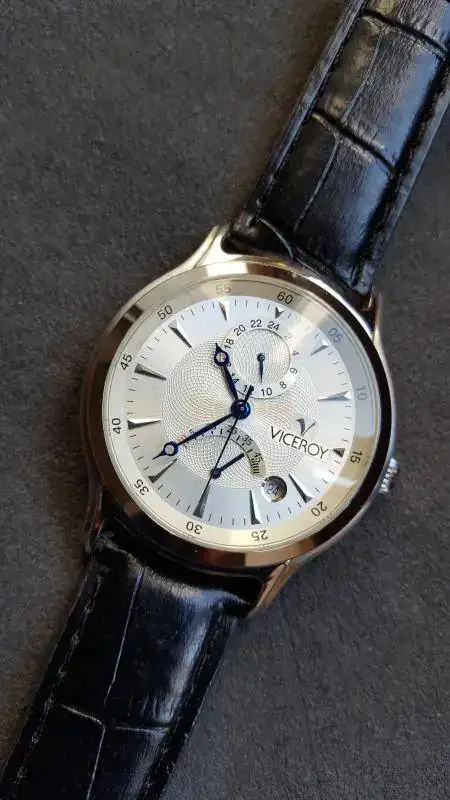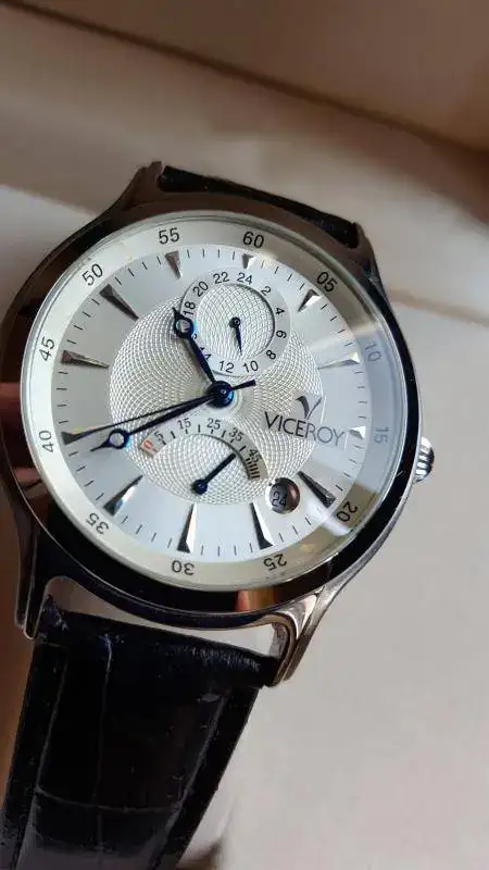 Pues saco a la venta este reloj automático con indicador de reserva de marcha cal Miyota, e indicador de 24 horas esfera guilloche y muy elegante con un tamaño de 39 m.m. y diría que a un 99 %. Yo he sido su único propietario, correa nueva, no de la marca, por cuestiones de igiene aunque se adjunta la suya, caja y documentación. indices plateados y agujas pavonadas tipo Breguet.