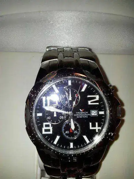 Saco a la venta este bonito reloj cronógrafo Viceroy 1/10 (desconozco su calibre). Tiene la esfera negra combinada con números blancos de muy facil lectura. La caja es de acero pulido brillante, el armis combina acero pulido mate con brillante y tiene una pinta muy contundente. La verdad, el reloj tiene muy buena apariencia.