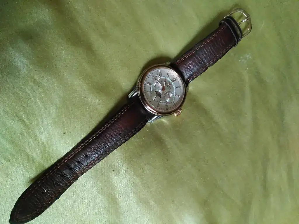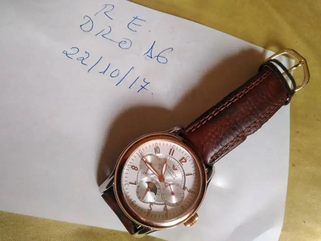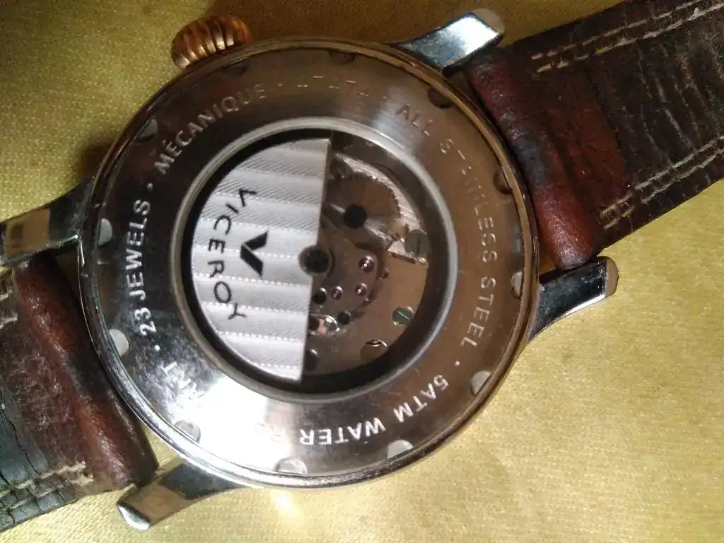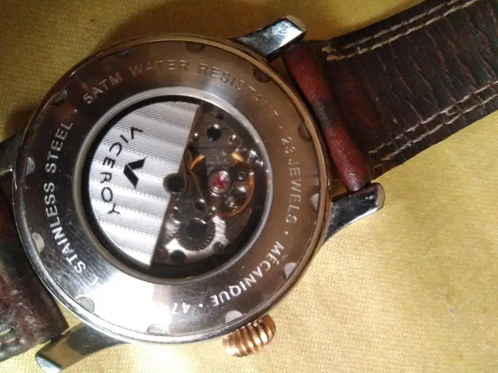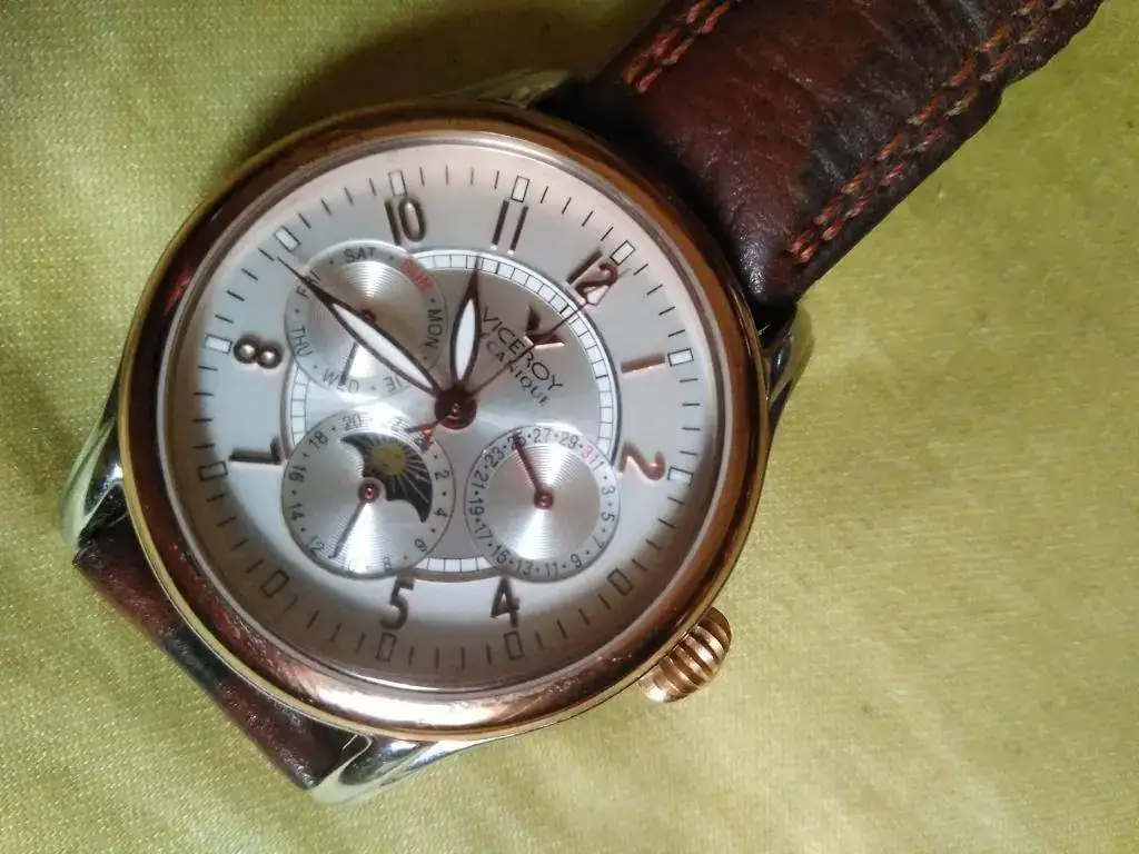 Oferto este distinguido reloj Viceroy Mecanique automático con GMT, indicación dia/noche y calendario analógico. Tiene fondo visto y es resistente a 50m, cristal abombado sin marcas. El bisel dorado tiene algunas ligeras marcas. La correa es de buena calidad, con doble pespunte, pero a mitad de vida.