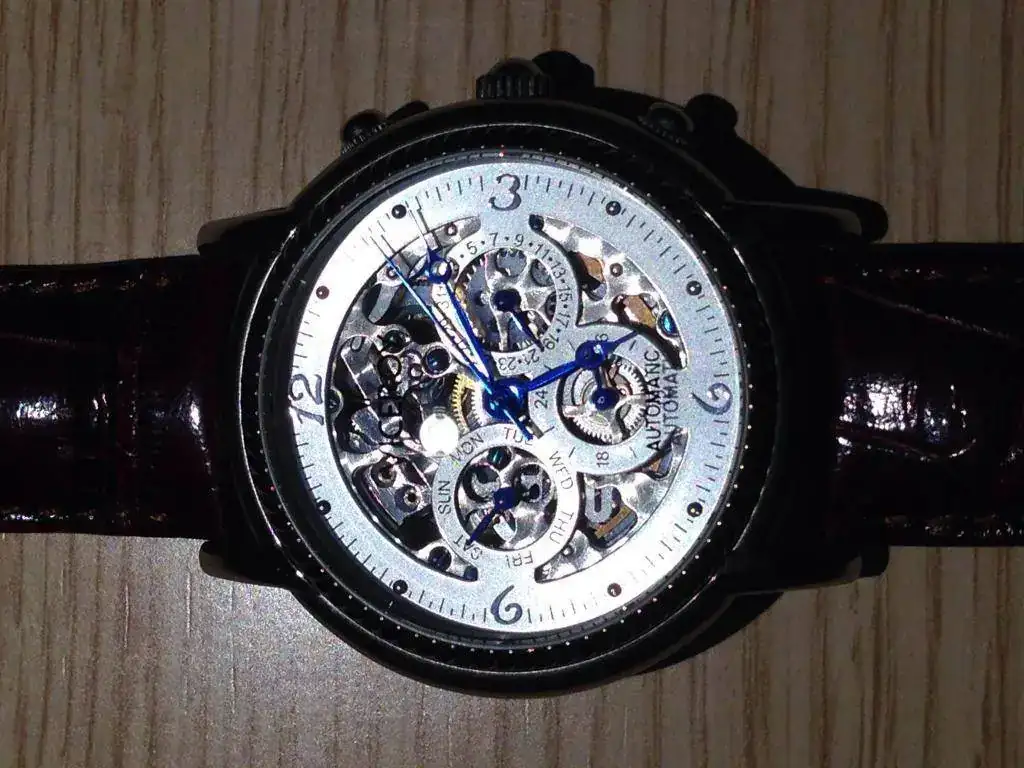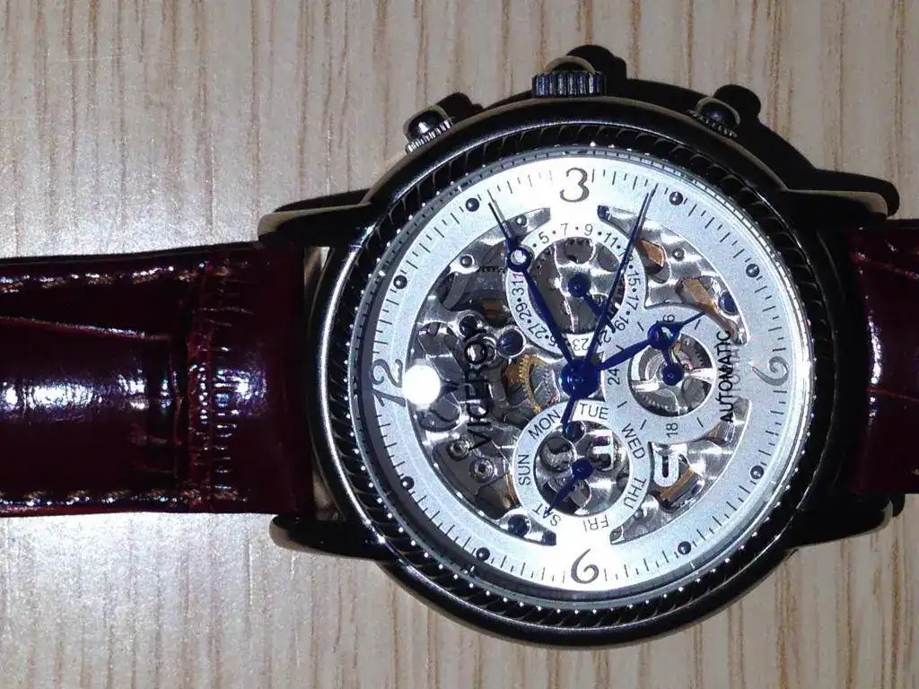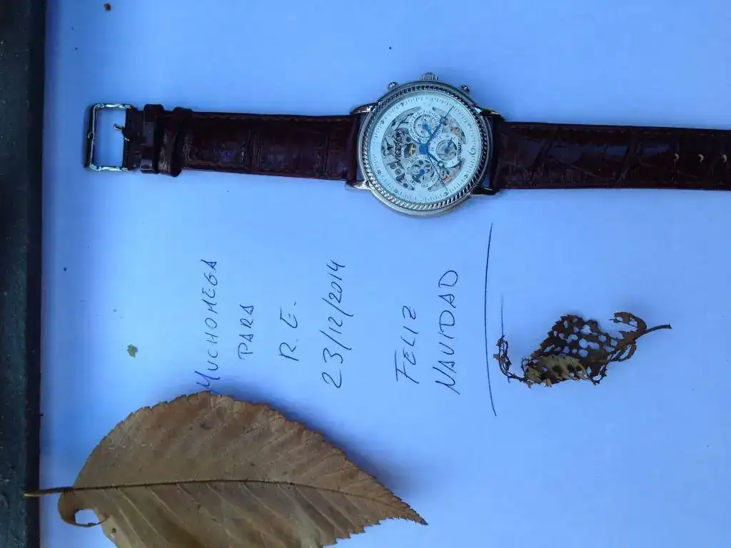 Viceroy automático con maquinaria y fondo vistos, agujas tipo breguet azules con subesferas datarias y bisel labrado. La correa es la original en perfectísimo estado. Lo he utilizado en dos o tres ocasiones ya que soy más de diver, por lo que siempre ha estado guardado. Tiene unas medidas de 41 mm sin corona y 43 mm con corona. Fué adquirido por mí en 2005 No tengo la caja ni documentación ya que se me extravió. El precio, 120 € puesto en casa por correo certificado.
