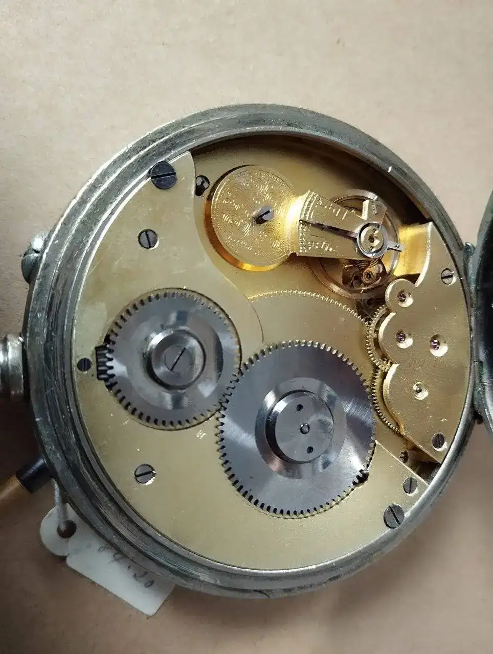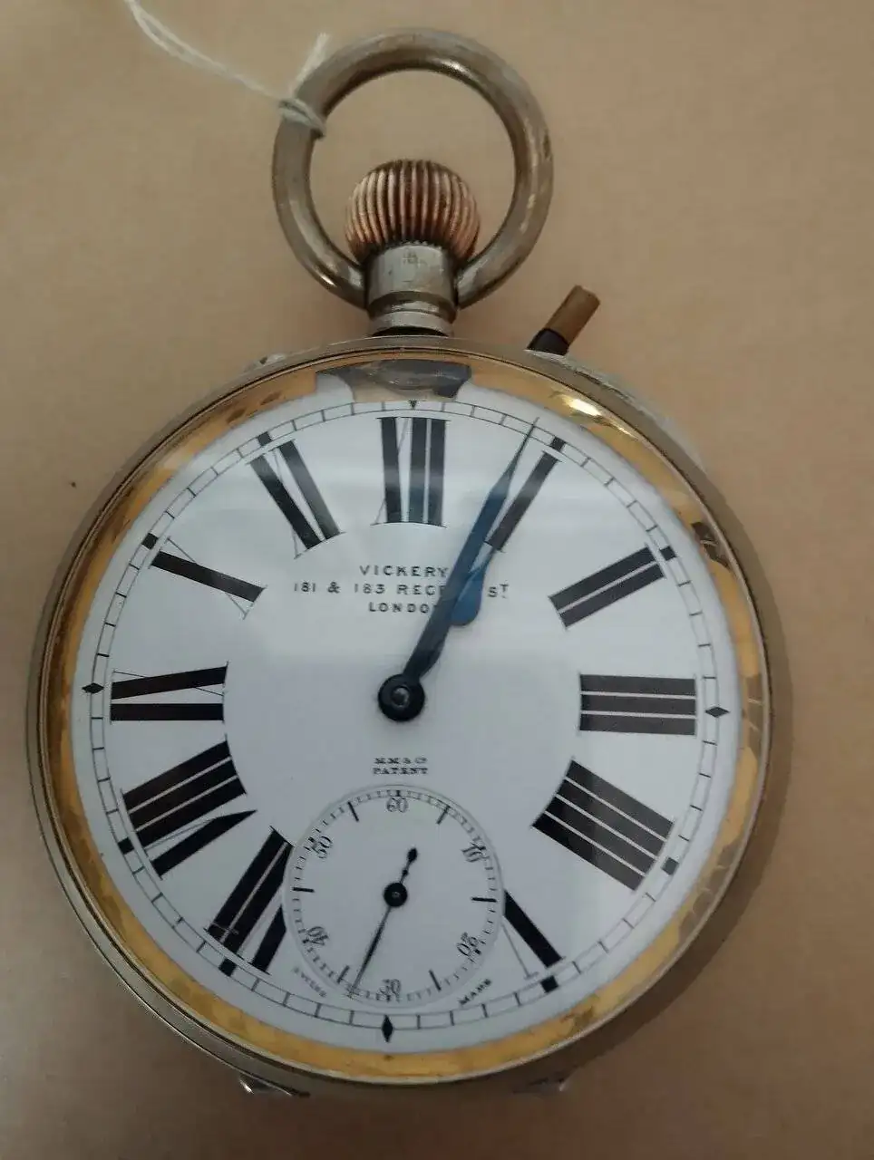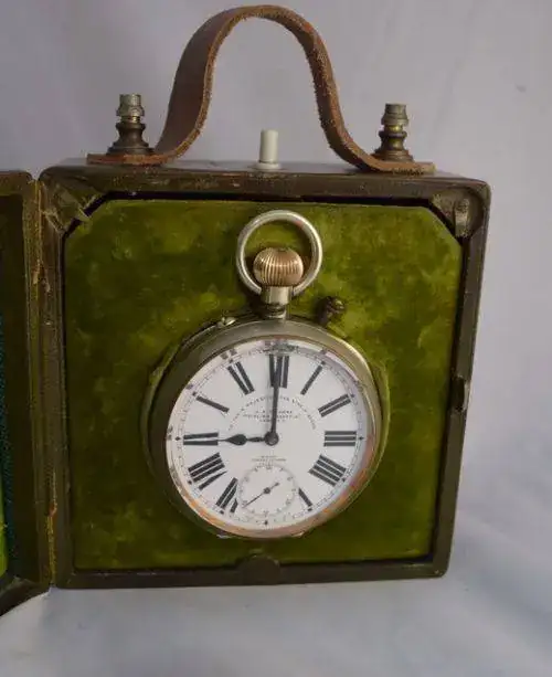 Un inusual reloj 'Goliat' con función de iluminación. La esfera esmaltada firmada Vickery' con la dirección de la calle 181 & 183 REGENT ST, LONDON. Junto con la 'Patente M M & Co . Un movimiento con una duración de 8 días dentro de la caja de níquel num 1363582. Posible alrededor de 1910. Parece ser que se ponía dentro de un estuche de viaje forrado en cuero y forrado de terciopelo que contenía la batería para encender la luz en la parte superior de la esfera del reloj, que se enciende mediante un botón en la parte superior del estuche. Ancho del reloj 7,5 cm