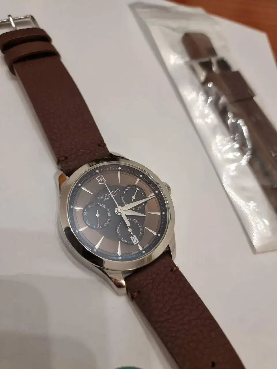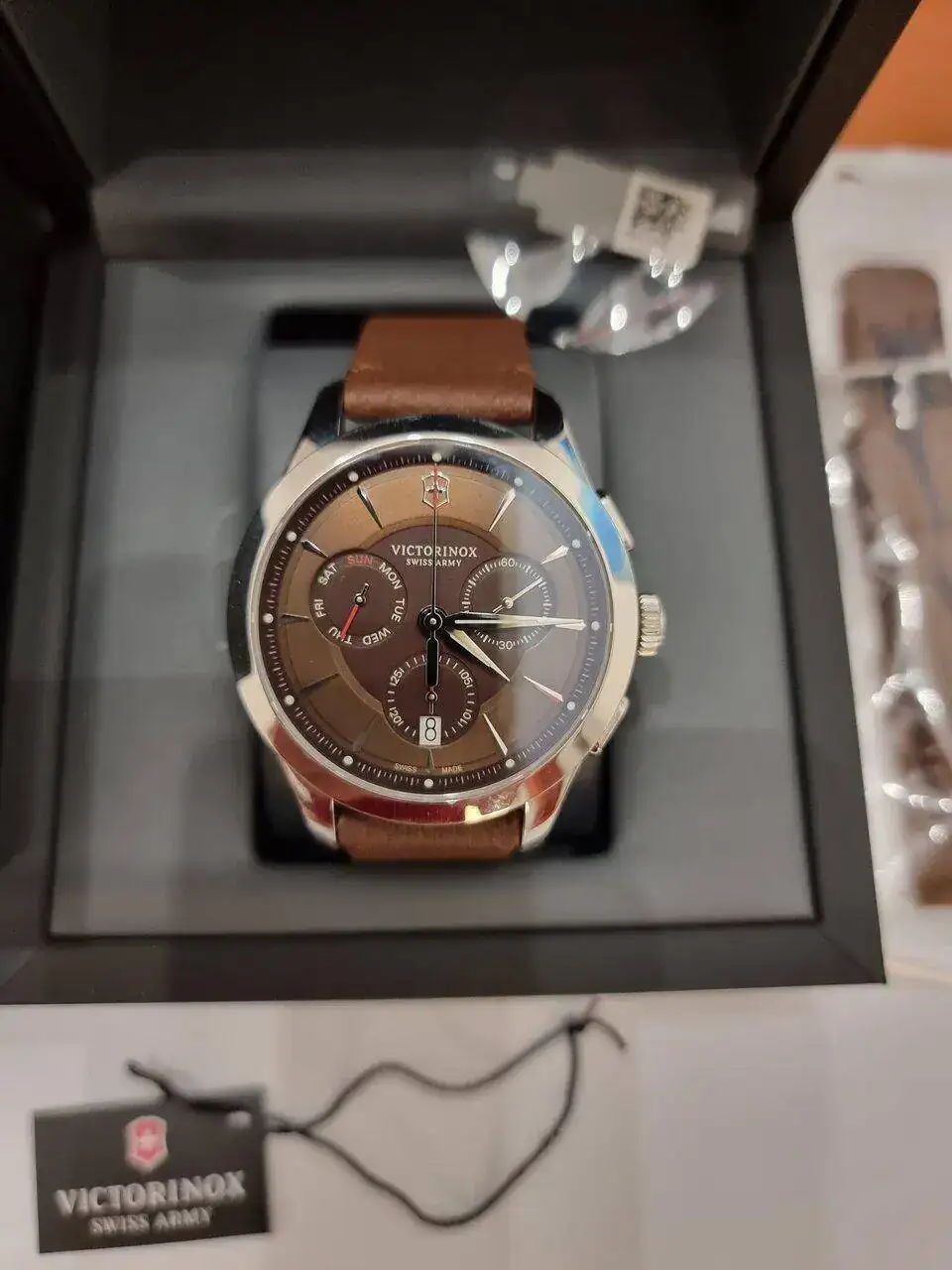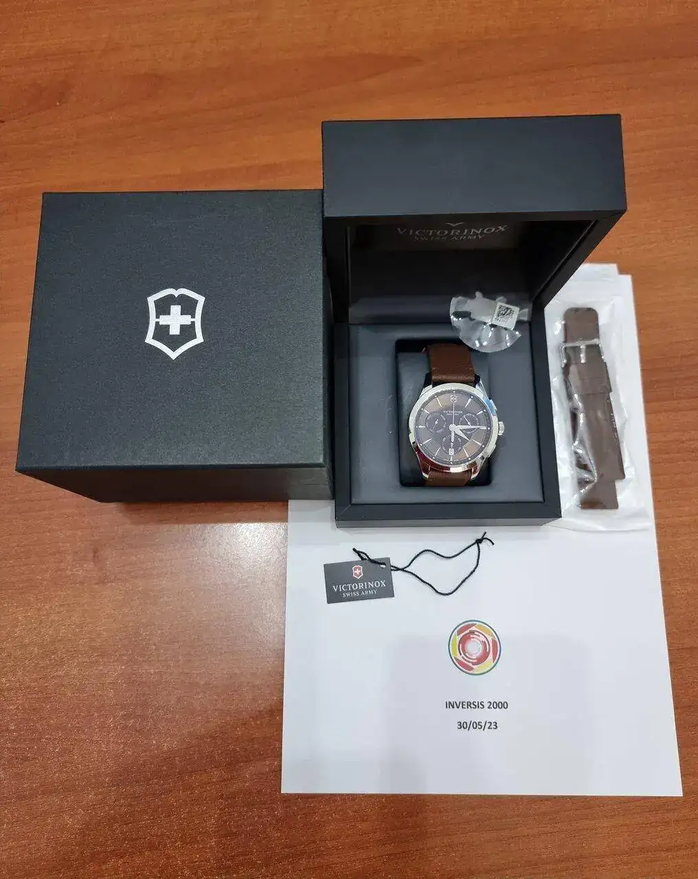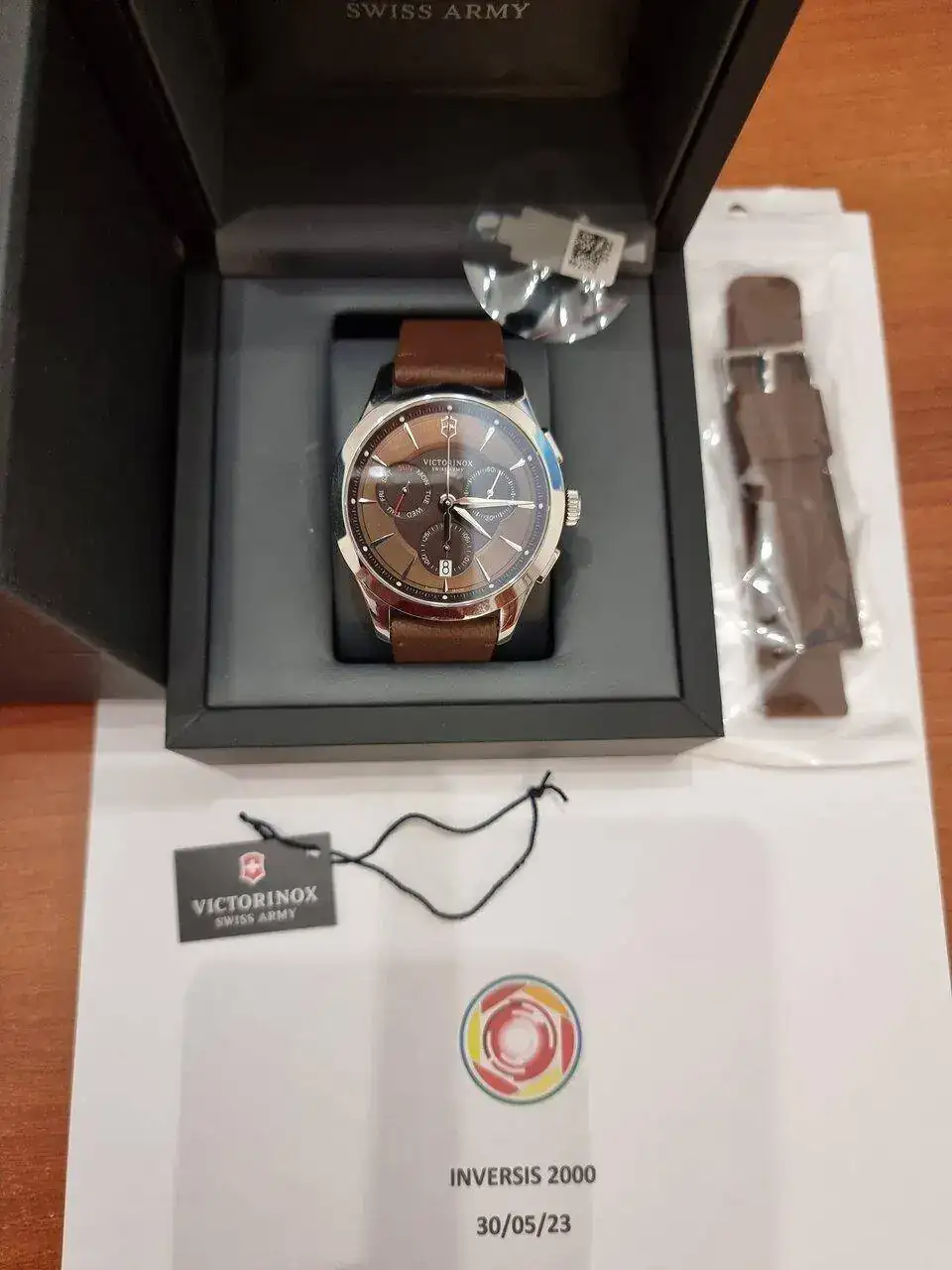Buenas tardes compañeros. Por la presente tengo el gusto de mostraros y poner a la venta una bonita pieza de mi colección particular en estado de auténtico re-estreno. Se trata de un Victorinox Alliance Crono, en color marrón, reloj muy cómodo y fácil de llevar con una calidad impresionante de esta firma suiza especializada en navajas y en las últimas décades también en muy nbuenos relojes. El reloj tiene la dotación completa de caja de presentación, documentación oficial y un segundo brazalete de caucho a juego con el reloj (el brazalete de piel que traia el reloj no ha sido utilizado) y cuyas principales caracteristicas a continuación os describo: