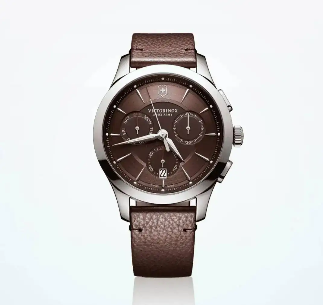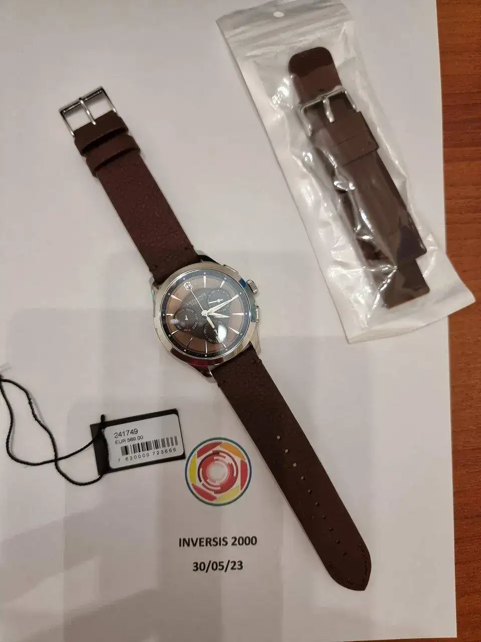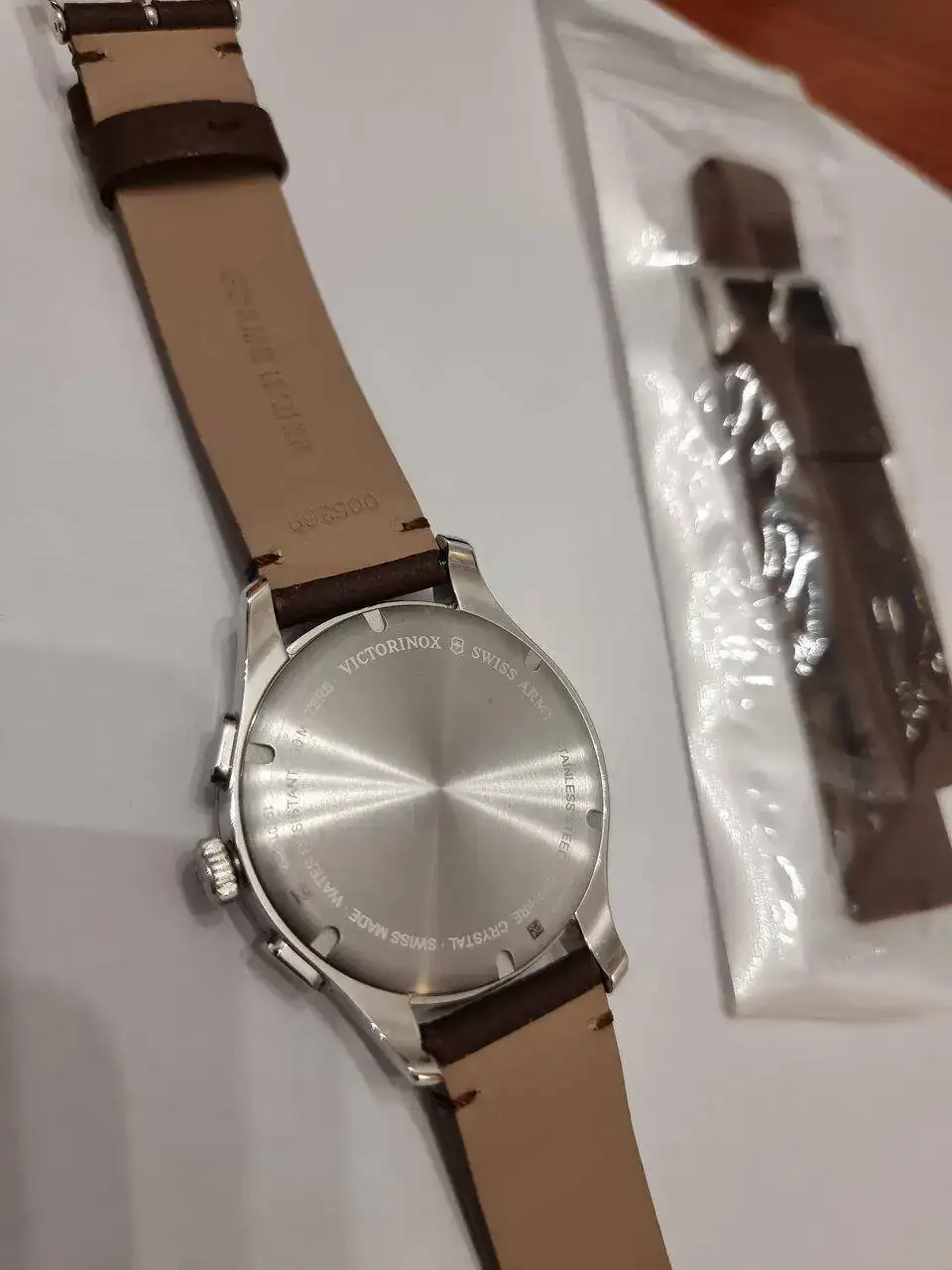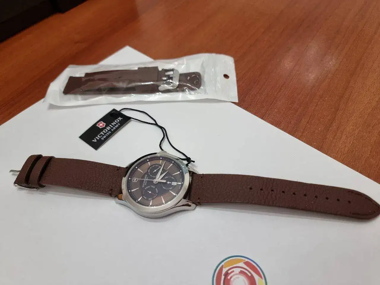 Buenas tardes compañeros. Por la presente tengo el gusto de mostraros y poner a la venta una bonita pieza de mi colección particular en estado de auténtico re-estreno. Se trata de un Victorinox Alliance Crono, en color marrón, reloj muy cómodo y fácil de llevar con una calidad impresionante de esta firma suiza especializada en navajas y en las últimas décades también en muy nbuenos relojes. El reloj tiene la dotación completa de caja de presentación, documentación oficial y un segundo brazalete de caucho a juego con el reloj (el brazalete de piel que traia el reloj no ha sido utilizado) y cuyas principales caracteristicas a continuación os describo: