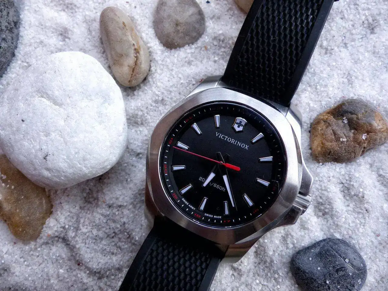 El dial es de un blanco “no nuclear”. En su interior encontramos once apliques insertados con borde plateado para cada hora y uno precioso a las doce, que es el escudo de Victorinox con borde dorado. La minutera y la horaria en color plata, con interior en blanco y la trotadora en dorado. Todo crea un muy bonito y equilibrado conjunto, que se refuerza de manera exponencial al contacto con la luz.