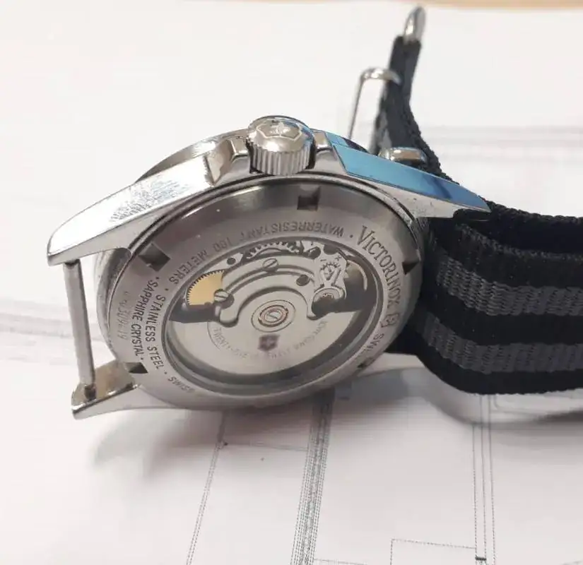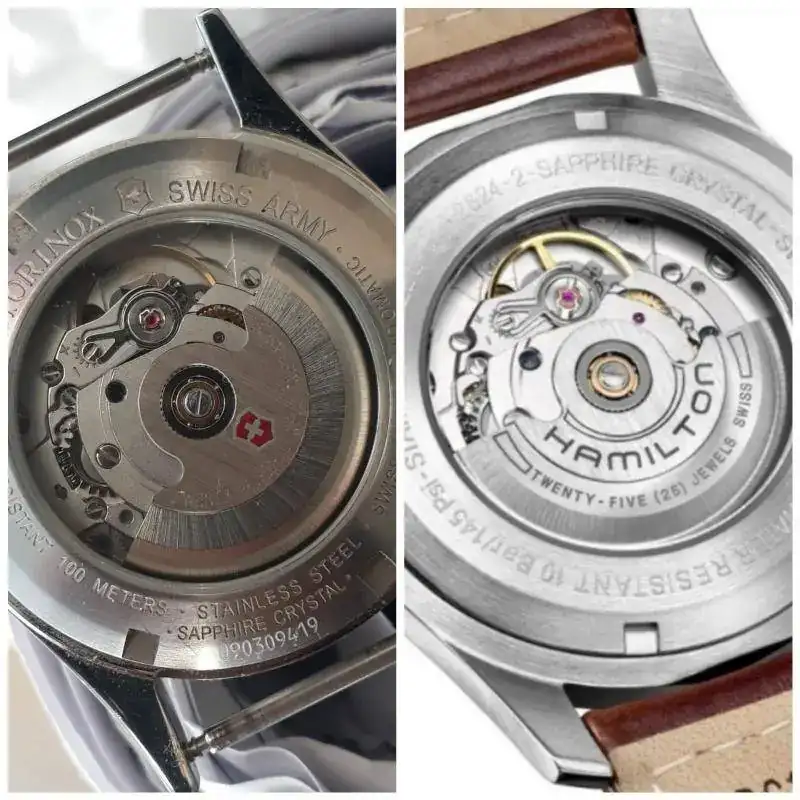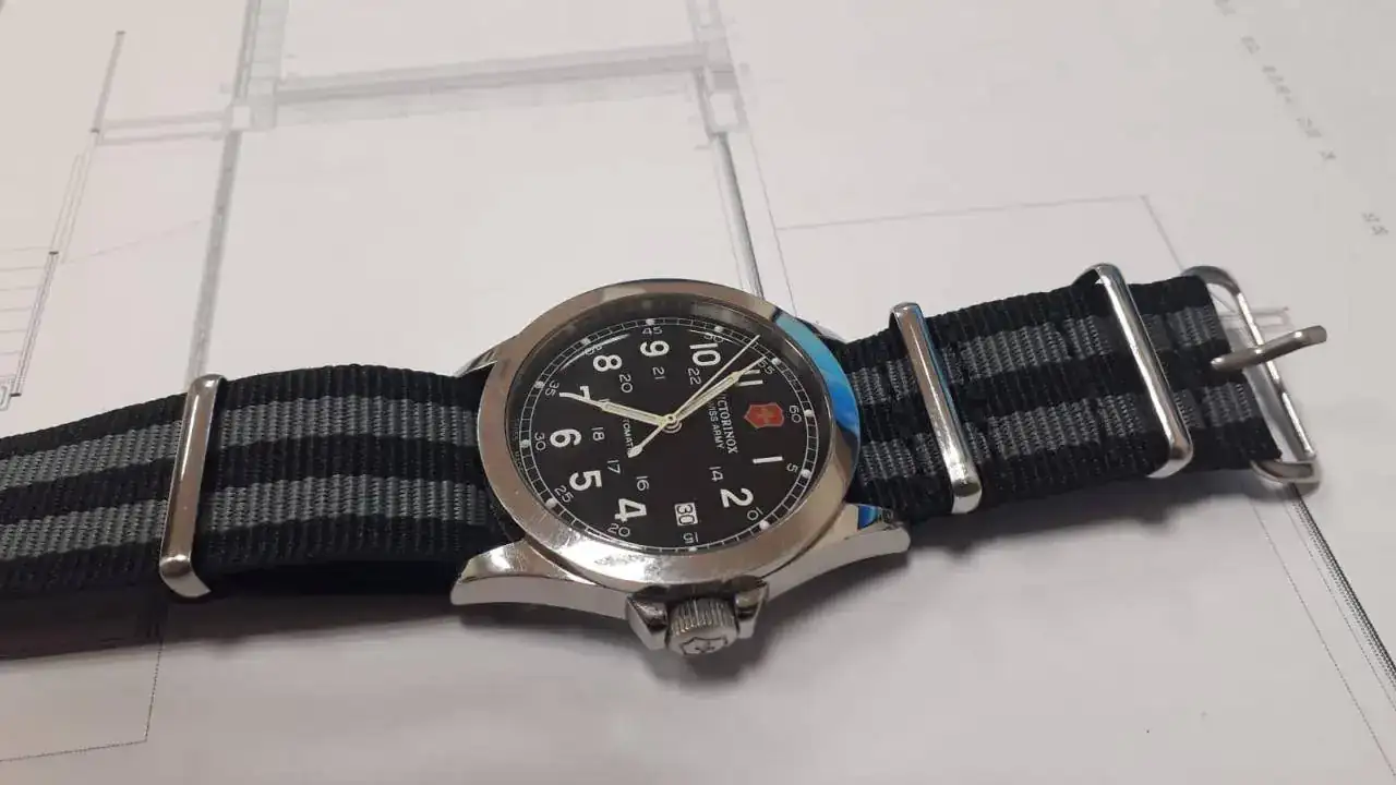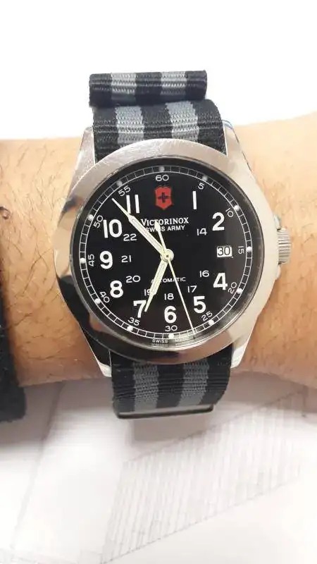 Yo expuse mi intención de adquirir ambos, porque me encantaban los dos, pero incidí que no tenía un Khaki aun, por la presencia en mi caja de este ejemplar: El Victorinox Swiss Army, que, aunque es de 38 mm(me gustan un pelin mas grandes), monta una maquina ETA 2824 (creo que la misma que monta el Khaki) , y que, a mis ojos inexpertos, me parece el mismo reloj. Aunque no sé porque, me gusta más el Hamilton, será por nombre.