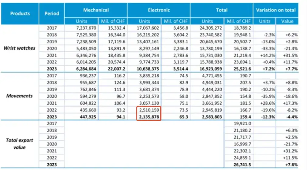 +1. No se, ni me interesa quien hace ese canal, pero no hay nada ahi que no se sepa ya desde que se publicaron informes oficiales de la industria Suiza.Vamos a ver. El titular es efectista indudablemente pero lo que es evidente es que en seis años las exportaciones de movimientos mecánicos han pasado de 936,000 unidades a 443,000, es decir, menos de la mitad y los electrónicos de casi cuatro millones a poco más de dos.