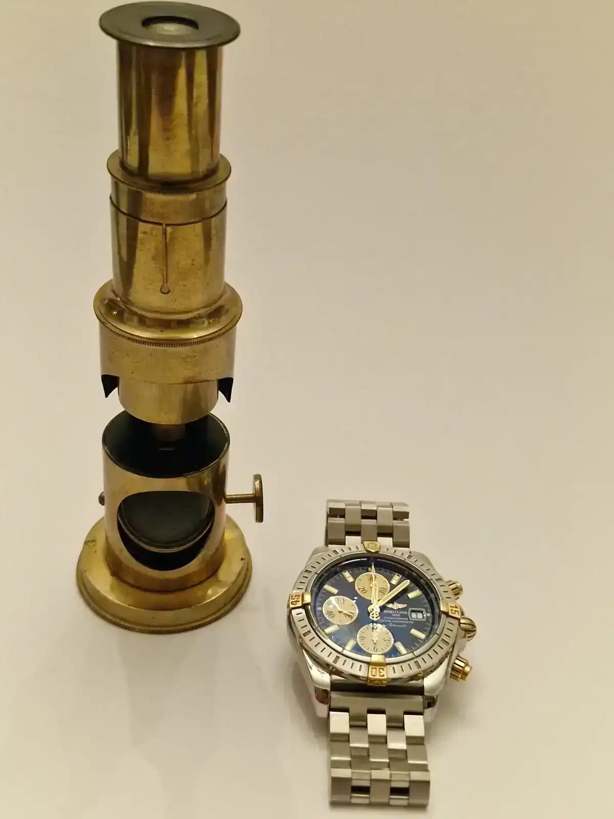 Toda la lógica, debería haberlo supuesto. Al verlo de bronce y al lado de tu Breitling, me daba la corazonada de ser un instrumento marítimo de navegación.Pues se trata de un microscopio, un modelo sencillo muy comun en una epoca. Está completo.