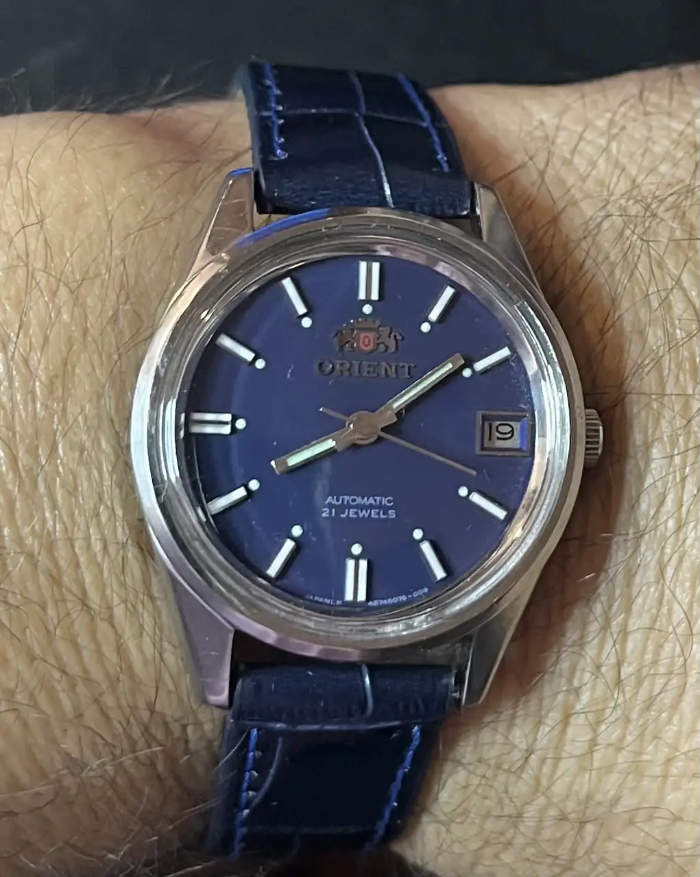 Y este pequeño Orient automático es el último de los tres que compré la semana pasada. Como el armis me iba pequeño, le compre esta correa a juego en la joyería del pueblo. Cómodo y discreto. Un saludo y muchas gracias.