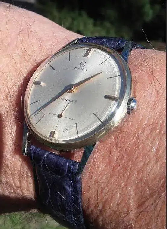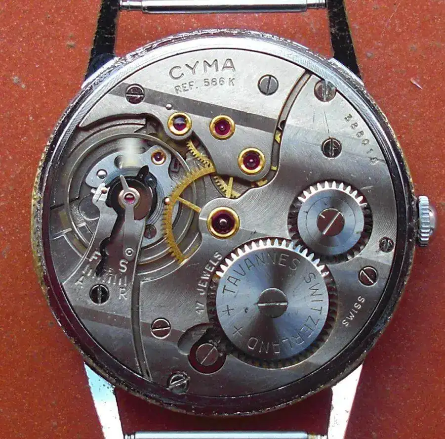 Yo creo, que CYMA solo hecho relojes en oro o en la caja cromada con fondo de acero. Muchos de los relojes de oro no son de fiar, o no son originales, no llevan numero y creo son producion espanola. Hasta hoy no visto ninguno en caja de acero, no entiendo por un movimiento tan bueno como el 586K. Es una delicia y con 15 lineas muy grande. Lleva los rubis en chaton, espiral Breguet, anitchoc sistema Cyma (Breguet),