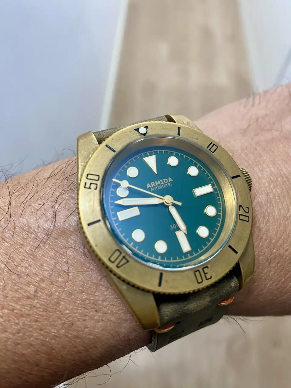 Conjunto muy chulo.Hoy con el Armida A1 de bronce y una correa personalizada por Zero.
