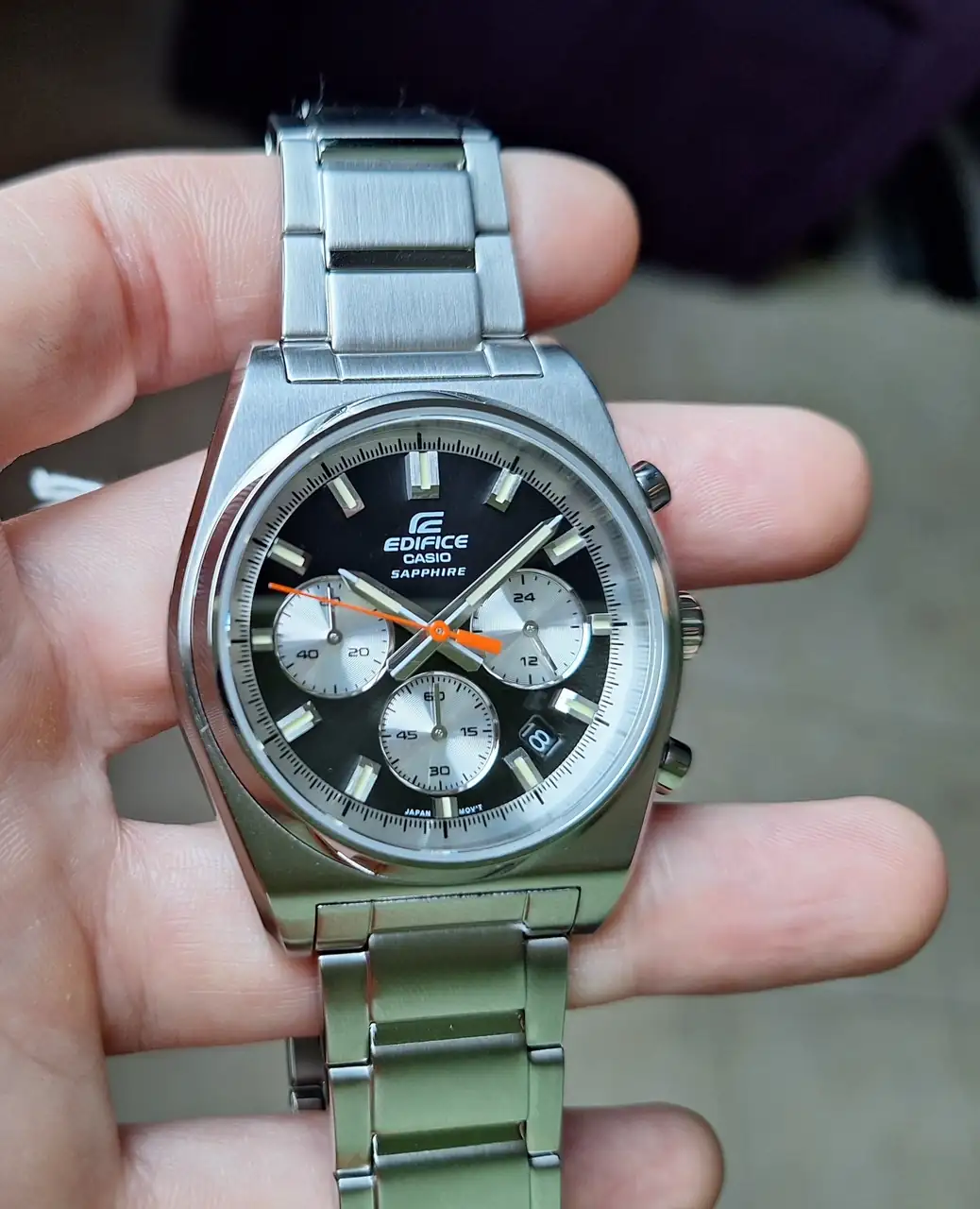Totalmente de acuerdo contigo, es realmente complicado pillarle un buen angulo y con la luz adecuada para que salga lo más parecido posible a como es en realidad.Lo bonito que es y lo difícil de reflejar su aspecto real en las fotos, tanto del color de la esfera como de los números aplicados.