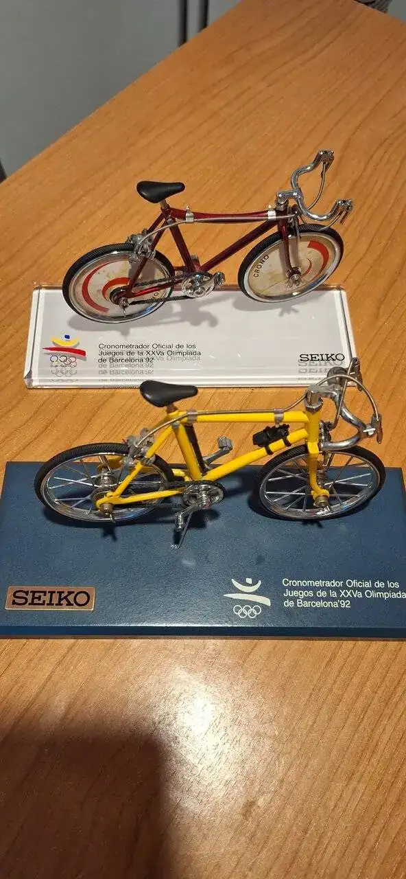 Las bicicletas (ajunto foto de las dos) las compré porque me hicieron gracia, Seiko como patrocinador y cronometrador oficial de los JJOO, supongo, que estas placas/bicicleta, la utilizarían como detalle a sus clientes o amigos...no lo sé, pero conozco otro chico que también tiene una.