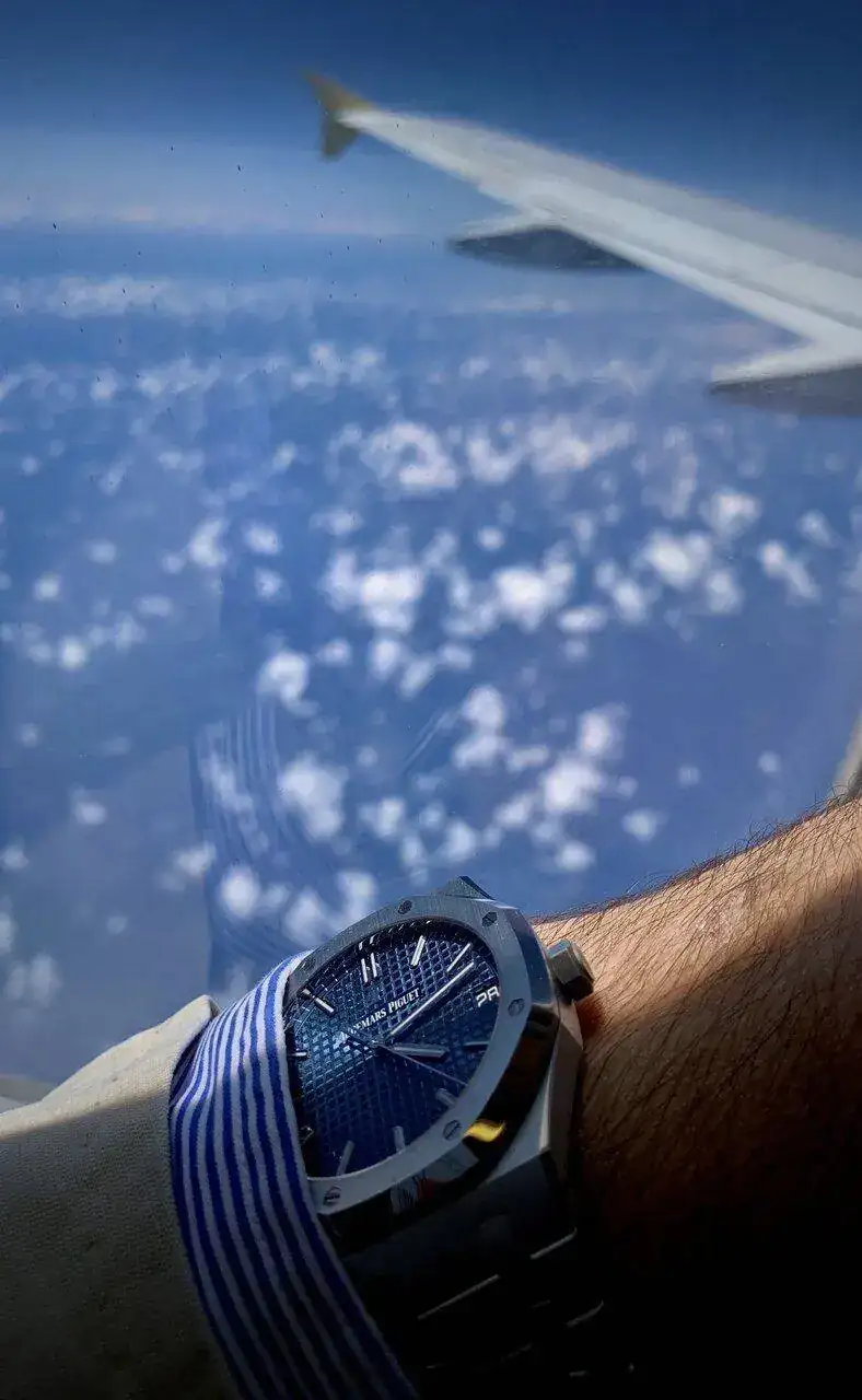 El más bello de los relojes de mi colección. Un RO 15500 con la esfera azul que es como llevar un trozo de cielo en la muñeca. Un reloj hipnótico, atemporal, clásico, irreverente y delicioso. Es imposible no enamorarse de esta pieza y no sentir que vuelas cada vez que lo llevas puesto. Definitivamente, el reloj que elijo para mis viajes más representativos y especiales porque me aporta verdadera magia e inspiración.