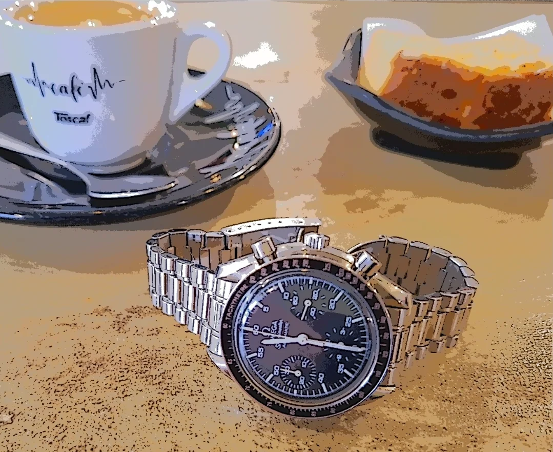 Pues es que me llevé a la cafetería el lienzo y unas pinturas, y mientras tomaba el café me puse a pintar un pocoBuenas tardes CarlosFantástico ese Speedmaster y cuánto me gusta, especialmente, ese brazalete.