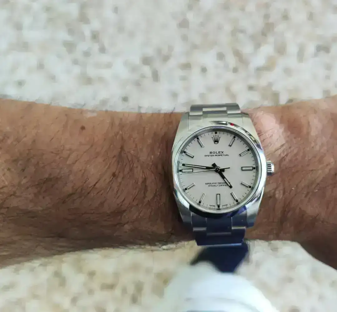 No se ven muchos OP34 en el subforo correspondiente. En mi opinión has elegido el más bonito de los blanco-roto de la gama Oyster Perpetual. Especialmente por cómo equilibra la combinación de los índices negros y su distancia a los bastones de la esfera.
