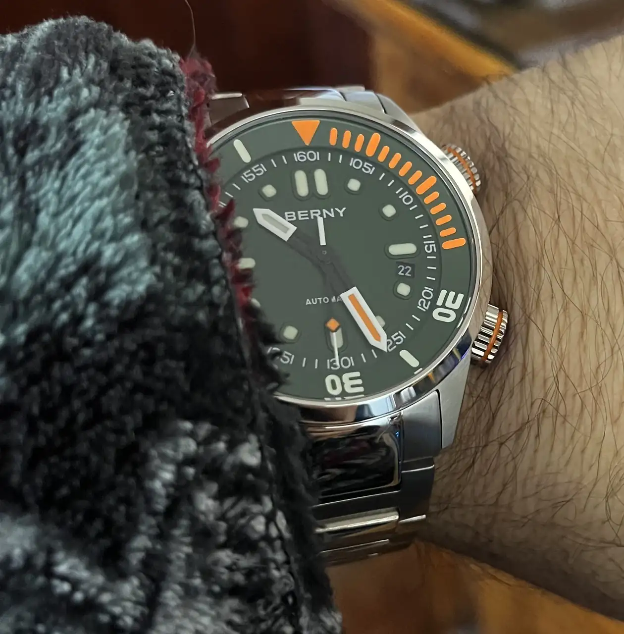 Le tienen que gustar los relojes contundentes. Es un reloj muy grueso y pesado, pero a mi me gustan así. Lo compré aprovechando el 11/11 de Aliexpress por 107 euros debido a lo que fui leyendo por ahí sobre la marca y sobre este modelo. Además, ya llevaba tiempo detrás de un reloj verde, aunque estuve dudando entre este y el azul, pero mi mujer votó por verde y me pareció estupendo. Me hubiera gustado un verde más intenso, del tipo de vegetación tropical, pero este verde inglés me parece muy elegante. Quise comprar, una vez recibido este, el azul y el negro, pero ya había pasado la oferta. No obstante, en cuanto pueda lo haré pues, algo me dice que será un reloj que con el tiempo, cuando esté descontinuado, será buscado por bastantes aficionados.