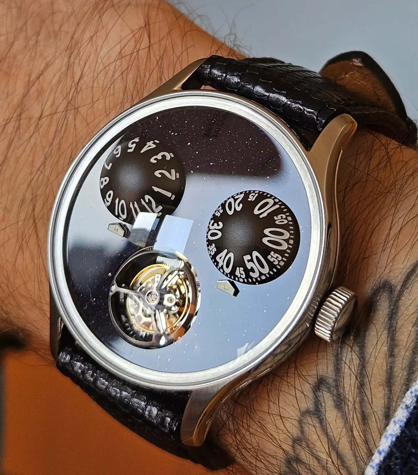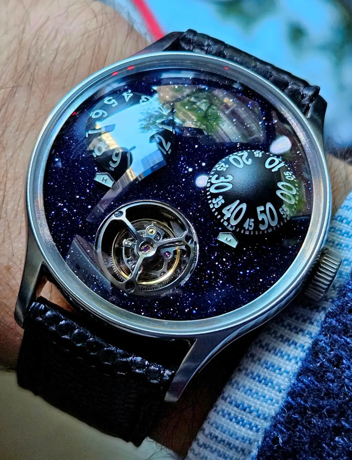 La verdad es que en persona mola mucho, primero por ver girando el tourbillon y luego porque la aventurina no es como si estuviese impreso / pintado sino que es una especie de esmaltado, altamente reflectante, al girarlo en la muñeca destellan diferentes trocitos de cuarzo y parece una galaxia, ademas cuando le da mucha luz de canto se ve así.Espectacular, en vivo debe de ser una pasada, es de esos relojes que me llaman muchísimo la atención y que me encantaría ver en directo.