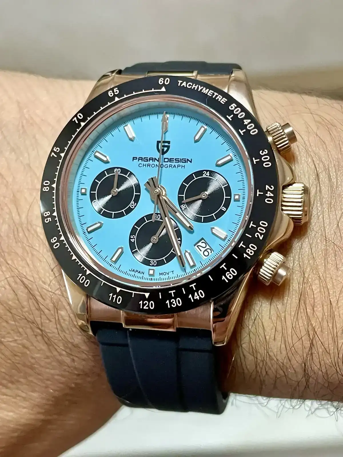 Enhorabuena. Es precioso!Hoy estrenamos el “homenaje” de Carlos Alcaraz, de momento muy cómodos esos 40mm y correa de caucho y los acabados habituales de Pagani Design con su movimiento japo VK63 cronógrafo 🩵