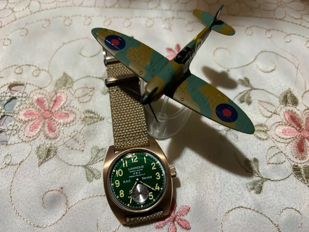 El reloj es un Seizenn del grupo Merkur , quiere recordar aquellos relojes que llevaron los pilotos ingleses en la Segunda Guerra Mundial, con remonte manual y de fácil lectura como debían ser.