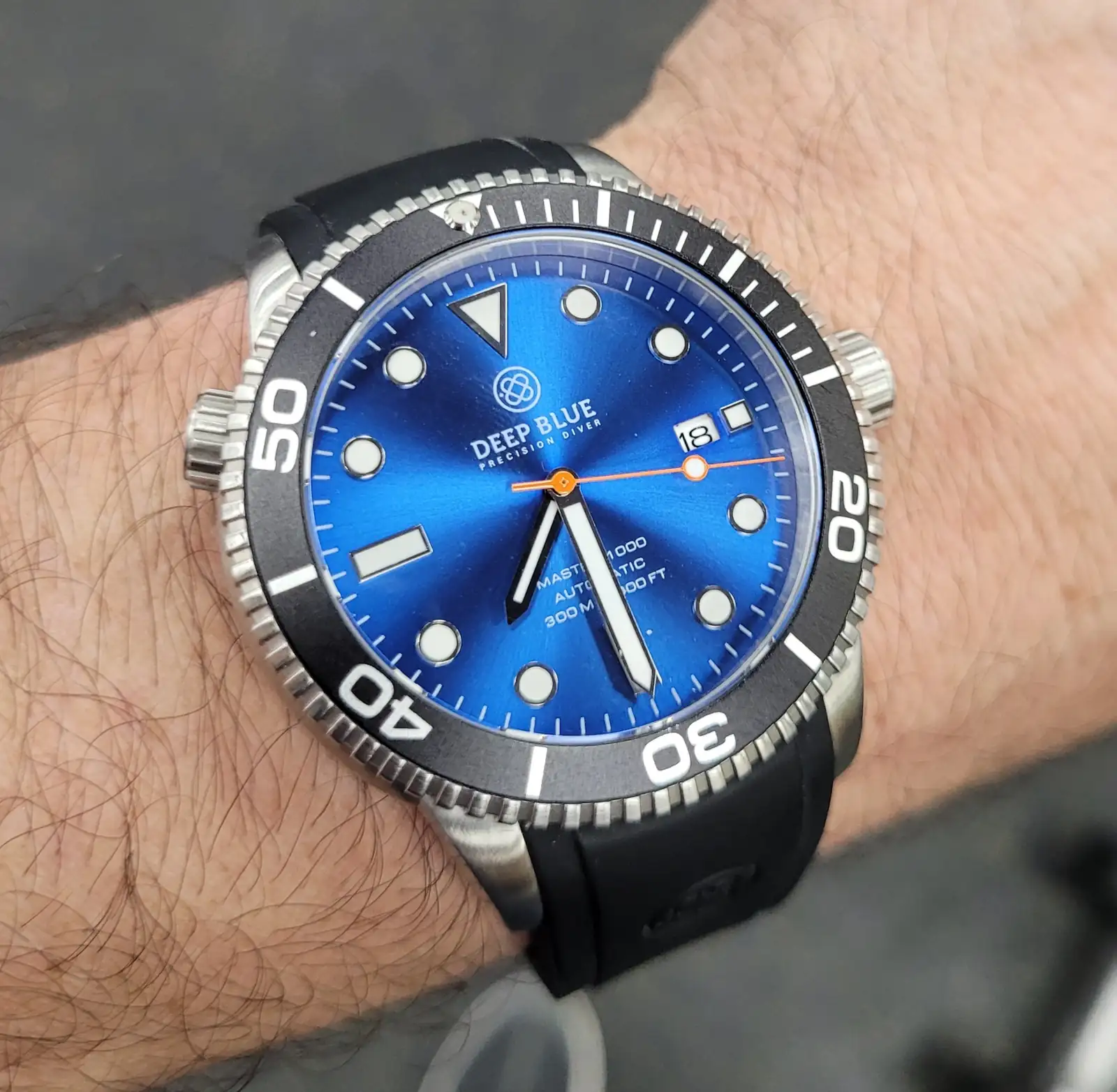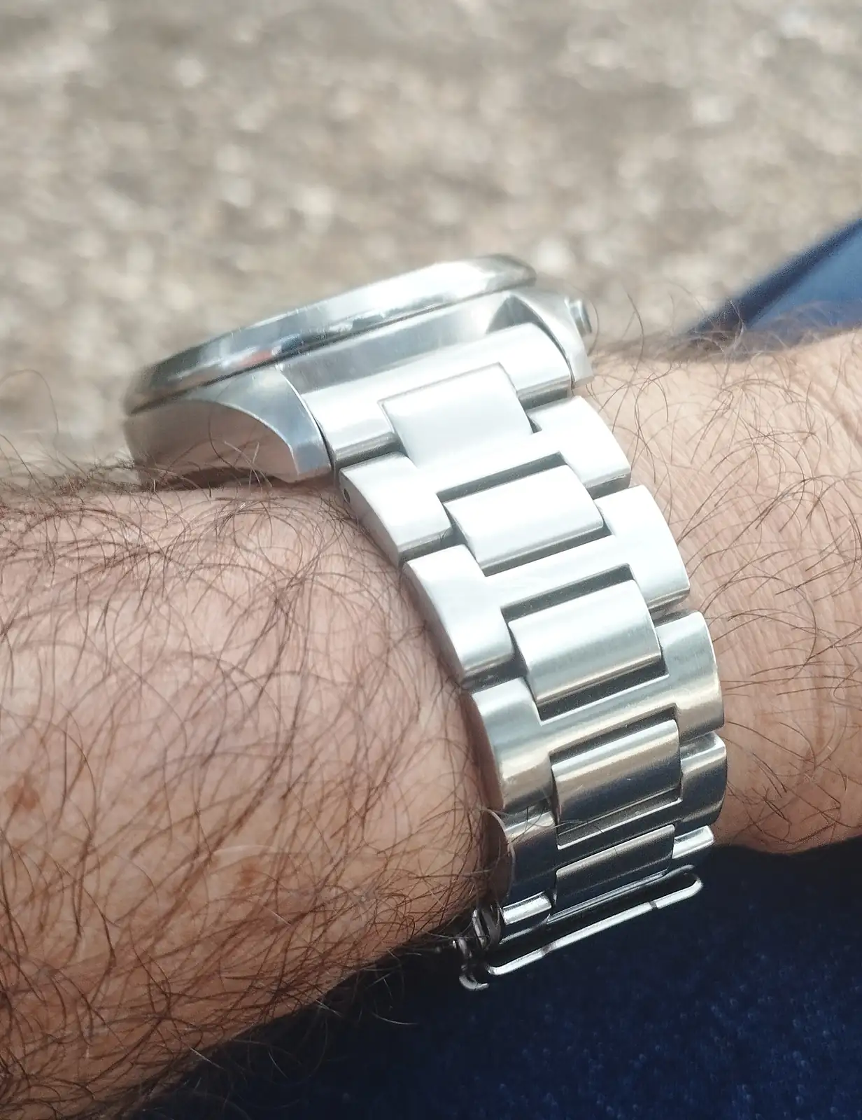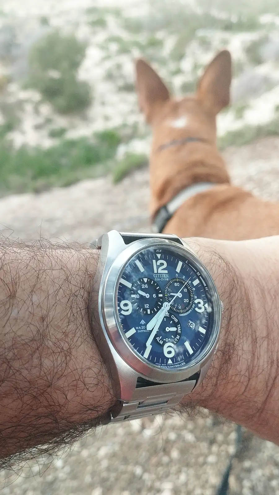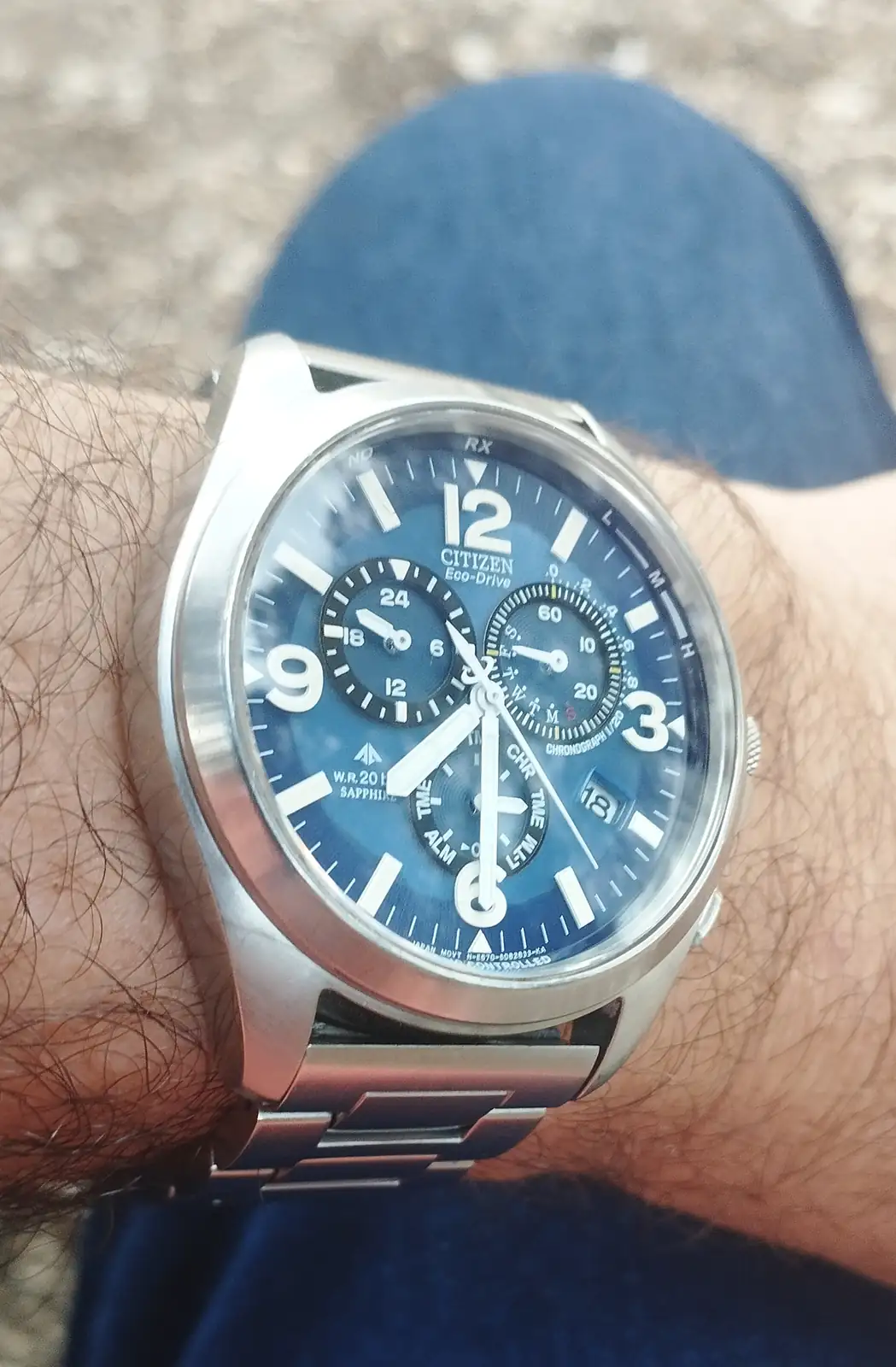 Citizen cronofield azul, con un brazalete peculiar, sin edlinks curvos, sin su correa original de nylon, pero de una marca curiosa… Y realmente cómodo. ( He dado por imposible, encontrar el brazalete de acero Citizen, para este reloj...).