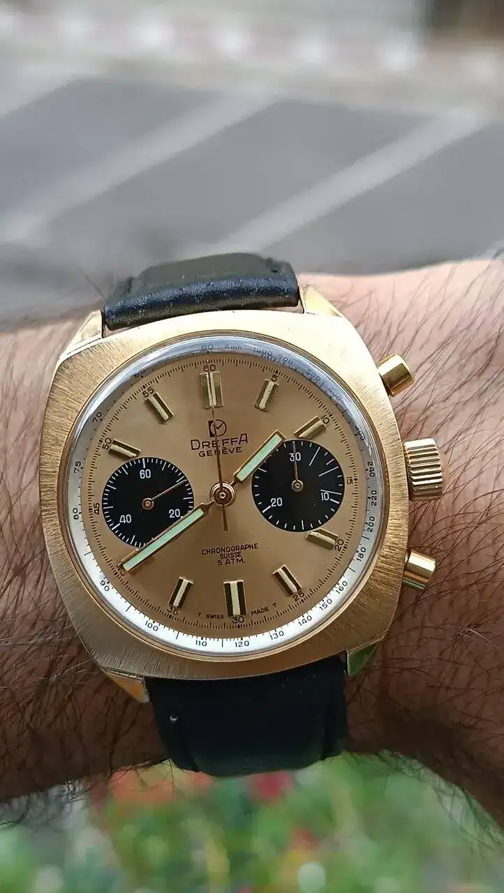Como para no estar encantado con ese reloj! No sólo es precioso, es que parece estar sacado de una relojería!! Enhorabuena Xabi!!Pues acaba de llamar el cartero (como siempre, dos veces), así que de panda inverso paso a panda dorado recién llegado. Un cronógrafo Dreffa con una estética muy de su época, muy dorada. Y prácticamente como nuevo, para la edad que se le supone. Aunque la verdadera riqueza para mí está en el interior, en lo que considero un corazón de oro: Valjoux 92.