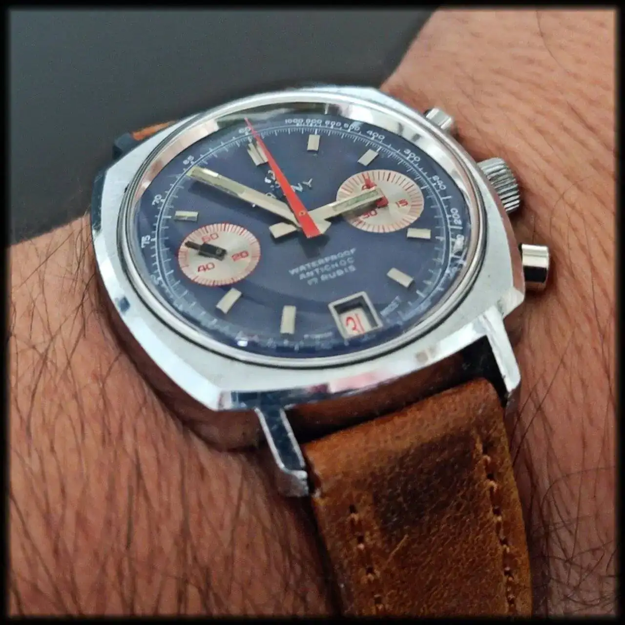 Un pequeño reloj muy apañado, bastante bien conservado, con un calibre Valojoux 7734 recientemente revisado y de un azul rayos de sol, entre azul oscuro y violáceo según le dé la luz, que me encanta.