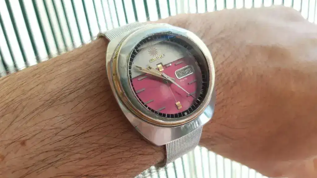 Es un Seiko Advan Helmet (se escribe así? No sé ahora. Pero bueno, Helmet es un nombre popular, no de pila puesto por Seiko, que quiere decir "casco de motorista" o algo así, y como yo soy muy mío, renuncio a ese nombre tan mal traído y lo renombro como Seiko Advan Frenatta, de Fresa y Nata Tarrina. ¿De qué iba hablando yo antes de abrir éste largo paréntesis? Ah, sí, ya retomo!) Es un Seiko Advan, de la vendimia de 1974; más exactamente de los meses de Marzo y Abril, que es cuando se produjo éste modelo, que es sin duda alguna el más estrambotico, estrafalario, surrealista y etecetecetecé de la Advan, serie que no destaca precisamente por ser contenida y elegante, y yo le alabo el gusto, así sea bueno o malo.