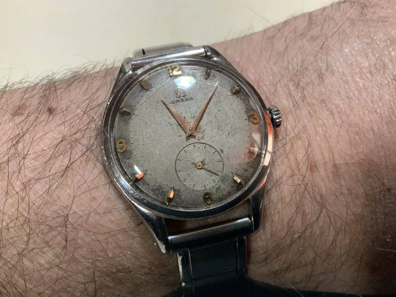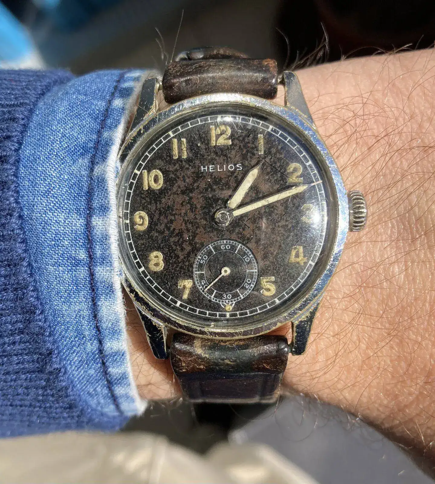 Gracias xsagasta. Pienso lo mismo. Cuando lo compré en un anticuario de Nuremberg, tuve opción de elegir entre otros dos D.H., en mejor estado ambos, pero elegí este precisamente por el toque que le aporta el deterioro que señalas. La correa también es muy antigua y me dijo el vendedor que era de manufactura de "trinchera", hecha con correajes. No se la he cambiado, ni pienso hacerlo de momento. ¡Un saludo!Preciosa cartografía la que ha labrado el deterioro en esa esfera.