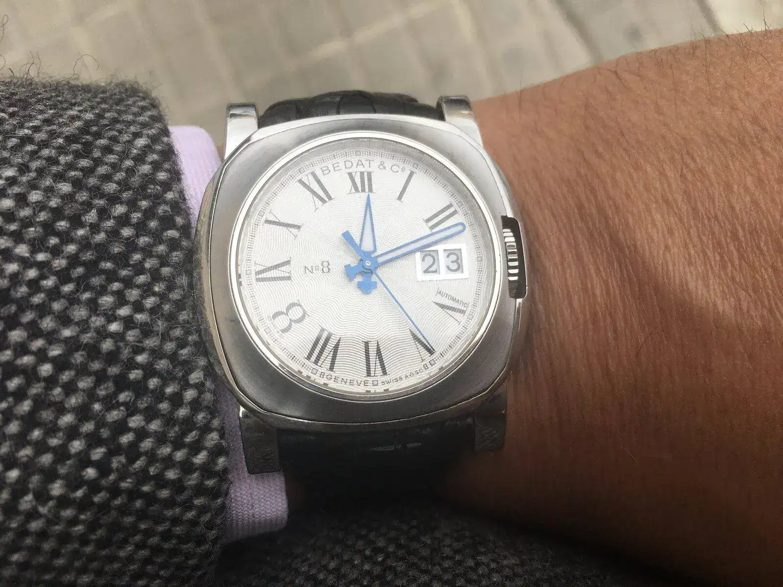 Me alegro de que te gusten la correa y el reloj, es un encargo a Jacob-Straps , así se la pedí para este reloj, pero por pitos o por flautas la correa se ha pasado de reloj en reloj, incomprensiblemente, este reloj viene con una marron que le queda muy bien y yo creo que por conservarla y también por variar fue la idea de encargar esta otra.Además de halagarme, me has hecho reír ¡Mil gracias, Miguel!