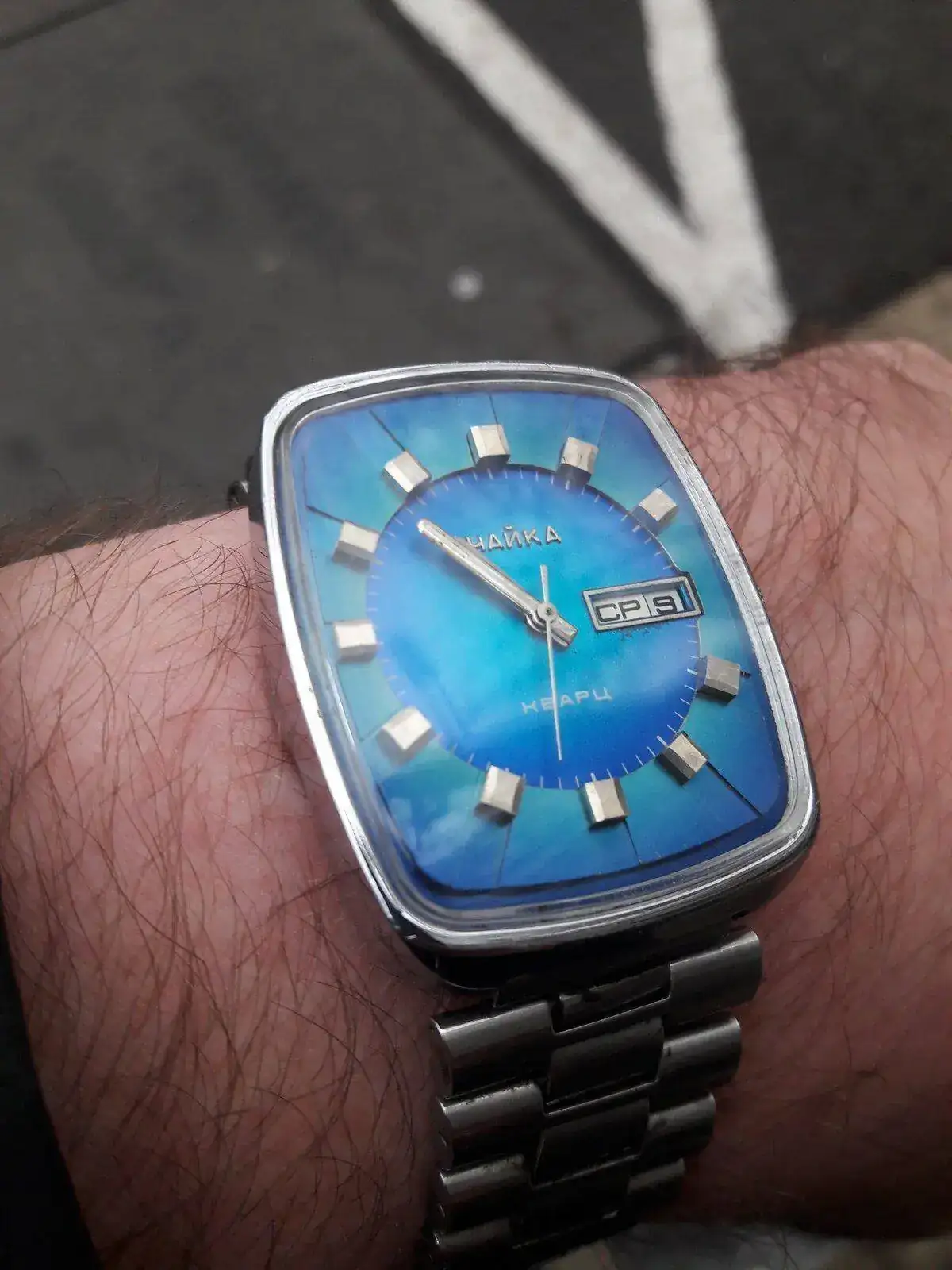 Para ser de pilas me está llamando ese modelo. Que azules más increíbles!Buenos días distinguida concurrencia vintagera. Hoy me habéis hecho recordar a un fantasma.... bueno. Puestos a lapidarme hoy con un Soviético Chaika resonator de cuarzo comprado en la ciudad ucraniana de Poltava.