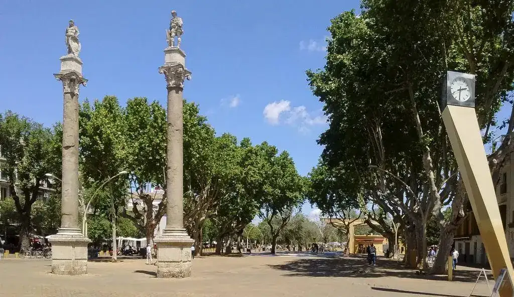 Como cuando paseo por aquí no me encuentro los Picos de Europa, como le pasa a Rosa, yo me tengo que conformar con las columnas de Hercules. Esta mañana, en el paseo, llegué a ver así de bonita la Alameda, pero esperando a que no pasara nadie casi se me va la nube que la hacía más bonita.