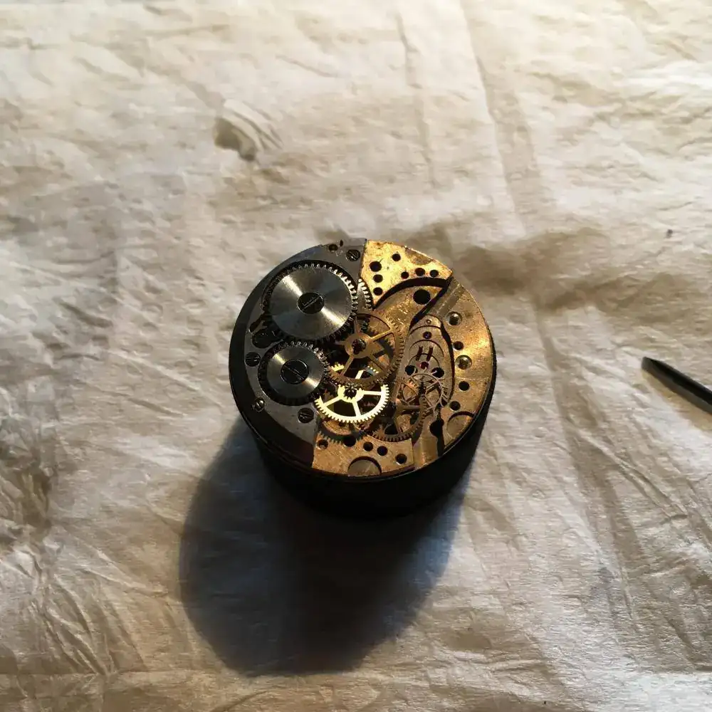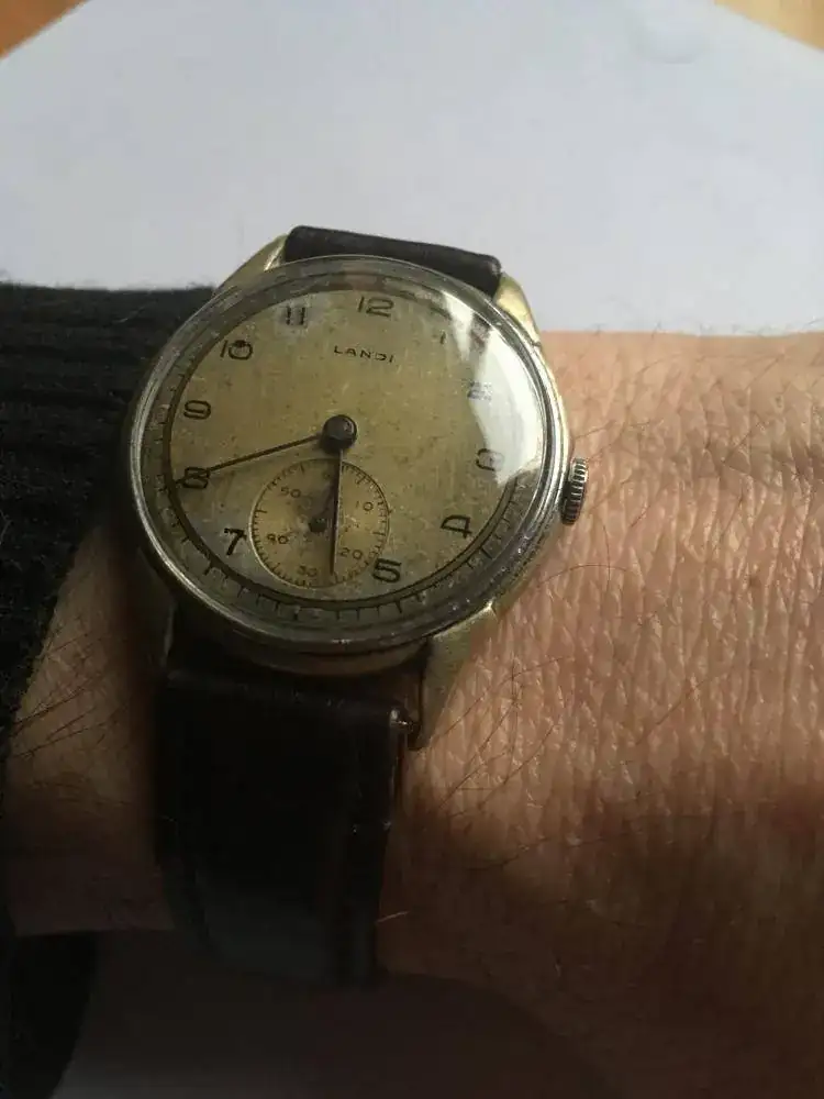 Hoy llevo este Landi al que tanto cariño le tengo porque ha sido mi reloj-escuela. Las muchas heridas en su esfera y en su caja dan fe de mi torpeza y falta de experiencia. Un bisel doblado al cambiar el plexi, un eje de volante roto al intentar volver a colocar las asas rígidas, una tija partida por una caída... Por eso he esperado a hacerle una limpieza como Dios manda y ayer me decidí. Hoy lo llevo para asegurarme de su excelente funcionamiento, algo casi milagroso tras semejante maltrato. Pero ahí está, el mecanismo AS 1203 es muy agradecido y funciona estupendamente. Luego volverá a la caja para un largo y merecido descanso.