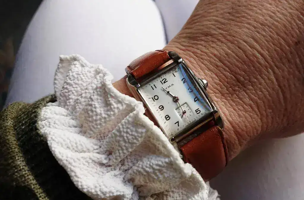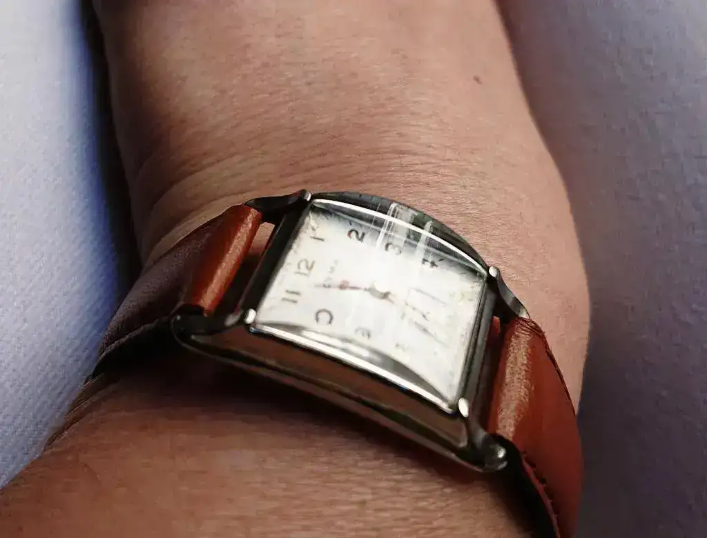 Cierto que su carita tiene cicatrices, pero no deja de tener un precioso rostro con varios detalles que me resultan encantadores: los rasgos poleroutianos del bisel, la numeración taaaaan cincuentera y la simpática redondez de la lupa del fechador. Junto con la elegancia de las agujas dauphine y que la caja tiene una presencia rotunda e impecable, muy cincuentera también ¡¡Me gusta muchísimo!!