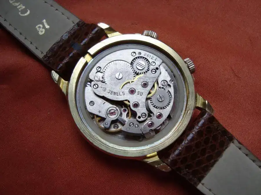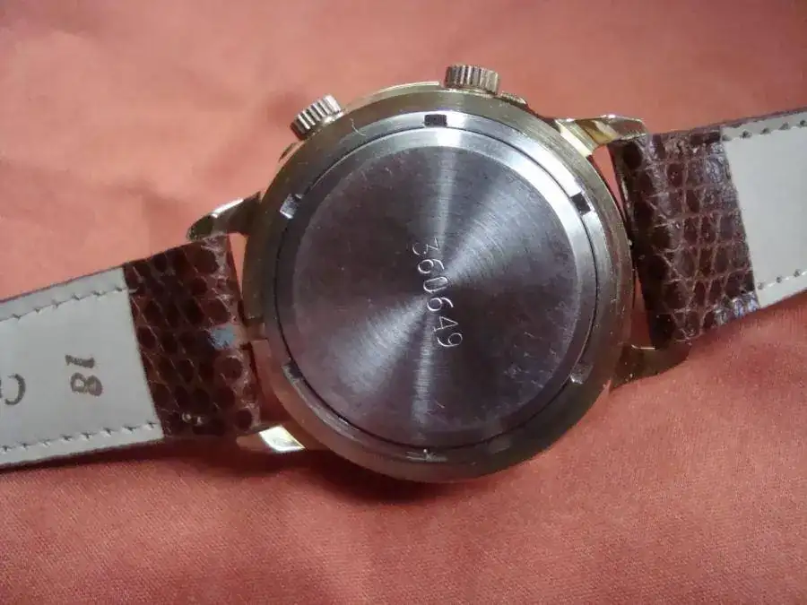 Calibre Vulcain 401, evolución del 120 para contemplar la inclusión del calendario y barrilete único, lanzado en 1.958. La alarma sólo dura 12 segundos, menos que su predecesor.