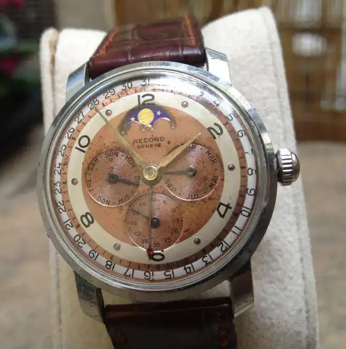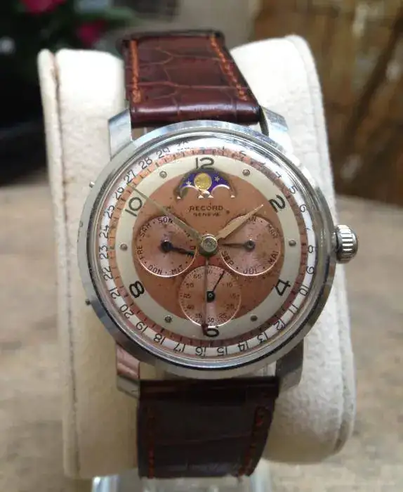 Éste que les muestro yo acaba de llegar y tiene la peculiaridad de llevar los mostradores en forma de mini-esfera y no en pequeñas ventanas como es habitual en éste calibre 107C de la Record.