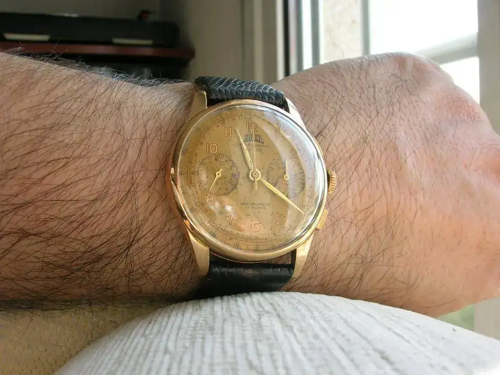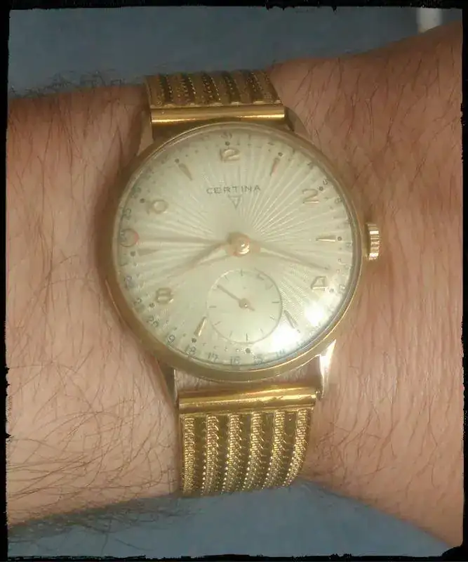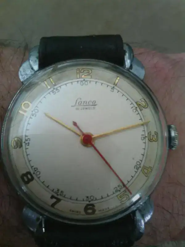 Muestro este venerable Lanco con maquinaria 1054 y una esfera más que bonita con la numeración dorada, dos tonos y segundero rojo. las asas tampoco se quedan atrás.