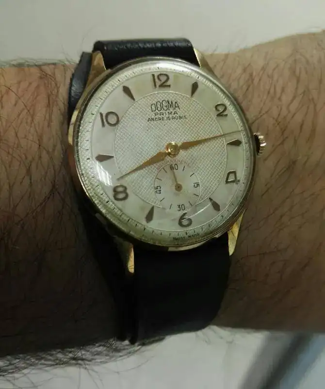 Hola,perdonad q no ponga foto; hoy un Omega automático Genéve de hacia 1962 con el cual he tenido una sorpresa ,investigando en la red la corona es la " suya" no teniendo logo, era una cosa q no llegaba a tener clara y como caracteristica más sobresaliente tiene parada de segundero además de poder darle cuerda en todo momento, ventana fechadora y bastones horarios ,lo llevo con una nato verde " soft".....Gracias por leer:).................