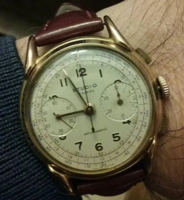 Buenas noches. Hoy os presento un modelo Studio, del cual no tengo ni idea. Pero se trata del reloj que mi madre le regaló a mi padre antes de su boda, por lo que tiene más de sesenta años y va muy decentemente de marcha.